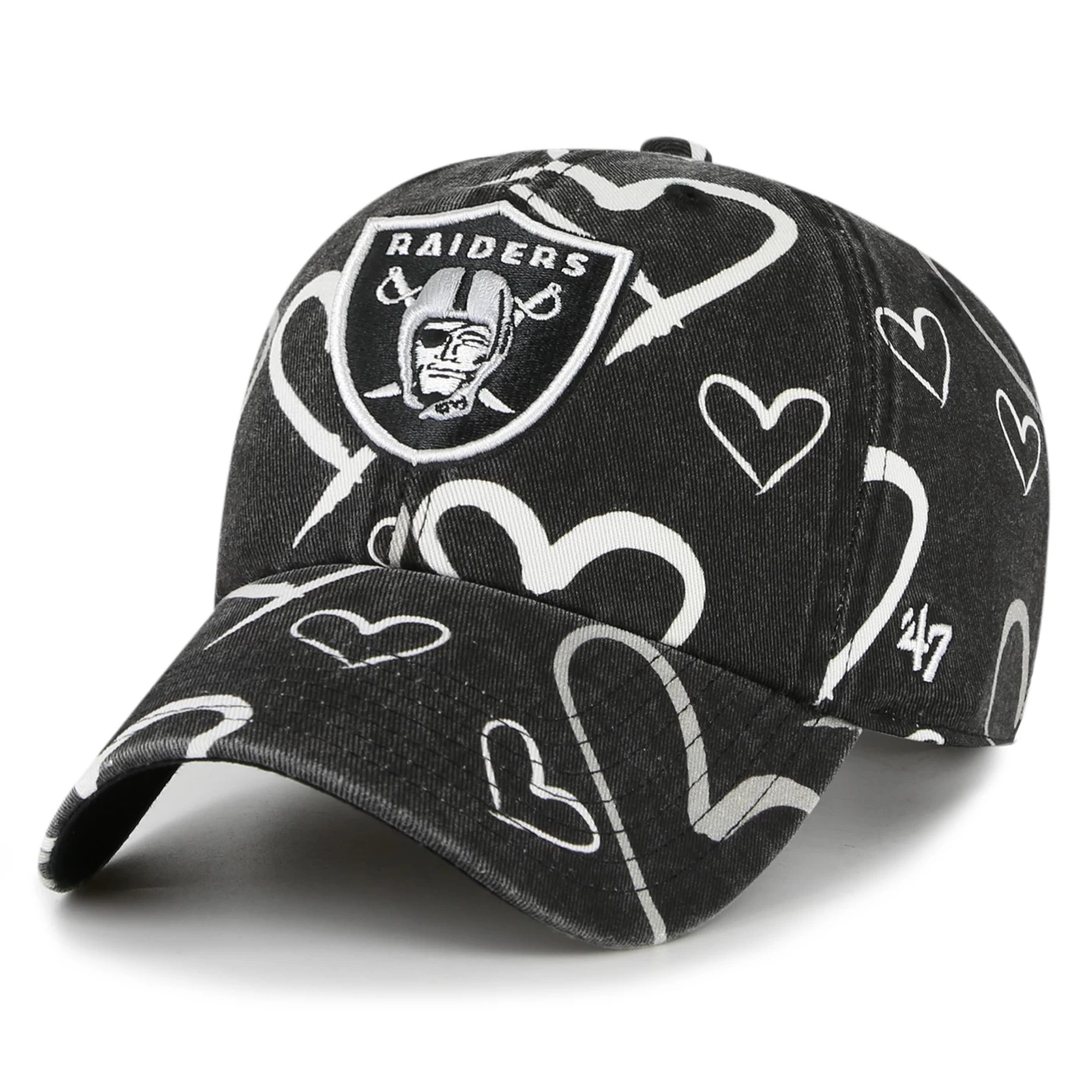 The Raiders ’47 Adore Black Clean Up Cap has a relaxed fit perfect for your little fan. This kids’ cap is designed with garment washed fabrication and features all-over heart print and an embroidered team shield logo at center front. Adjustable self fabric strap at the rear. 100% cotton twill.