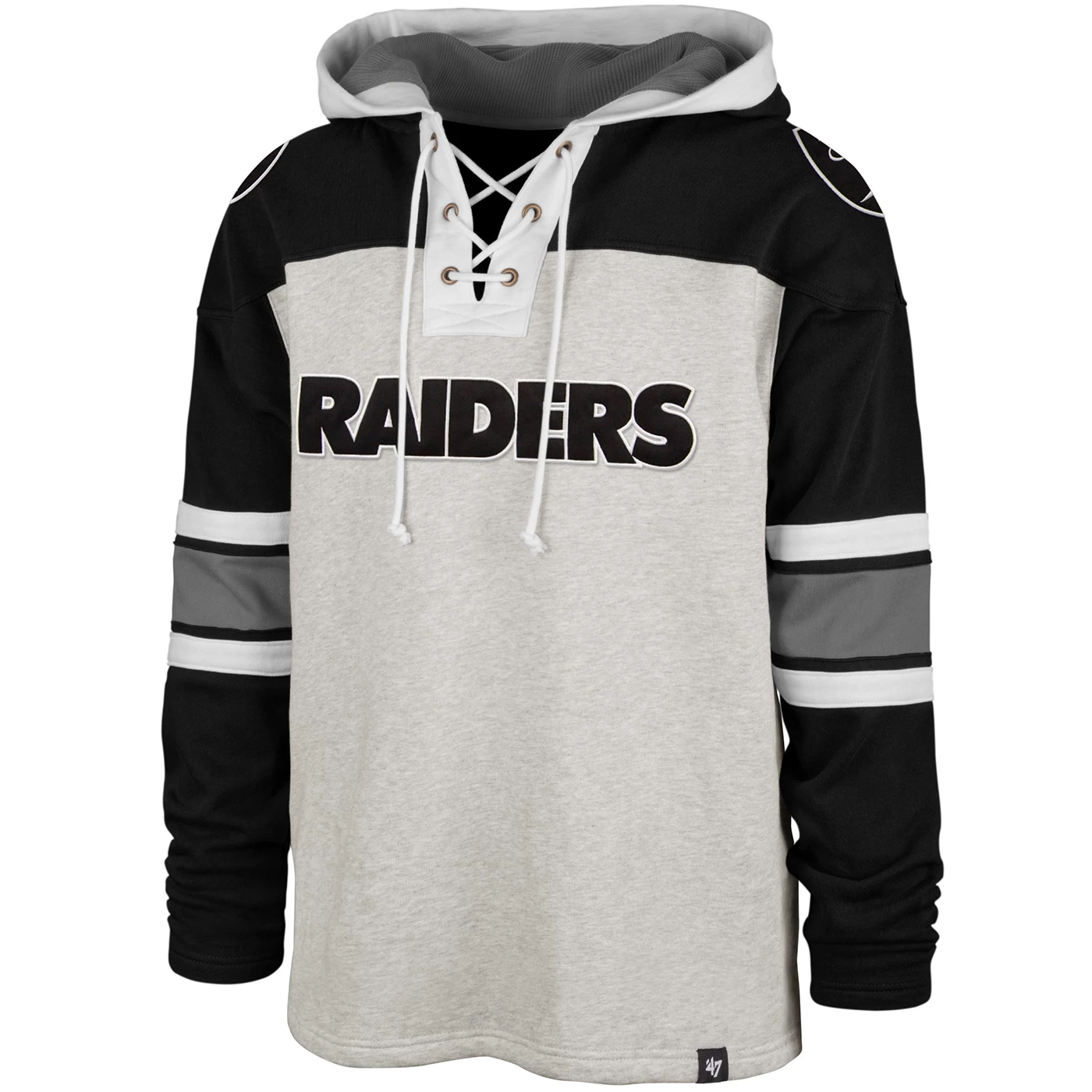 Perfect for every sports season! The Raiders ’47 Gridiron Lace Up Hood is designed with a midweight fleece hockey-inspired silhouette and features a team wordmark logo twill applique across the chest and team shield logo appliques at each shoulder. 80% cotton 20% polyester.