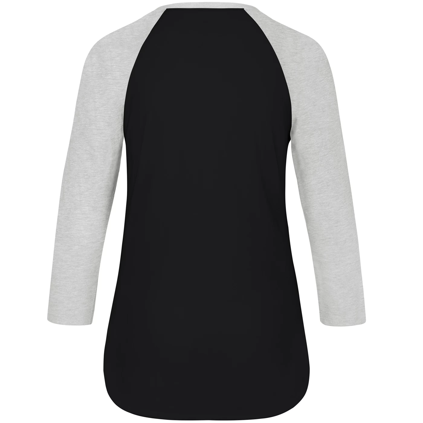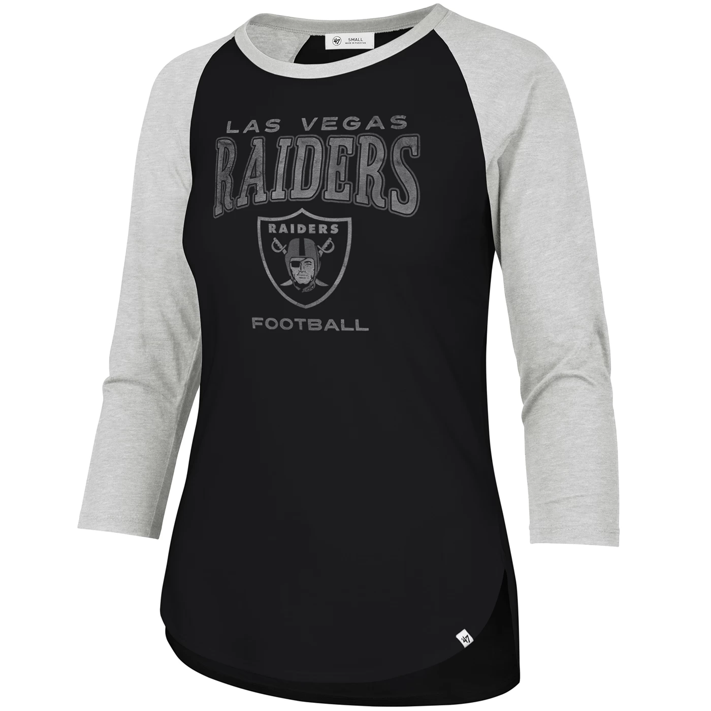 The Raiders ’47 Heatwave Raglan Tee is designed with a black body and relay gray sleeves and trim. This three-quarter sleeve tee features distressed team graphics printed across the body in matching gray print. 100% ring-spun combed cotton.