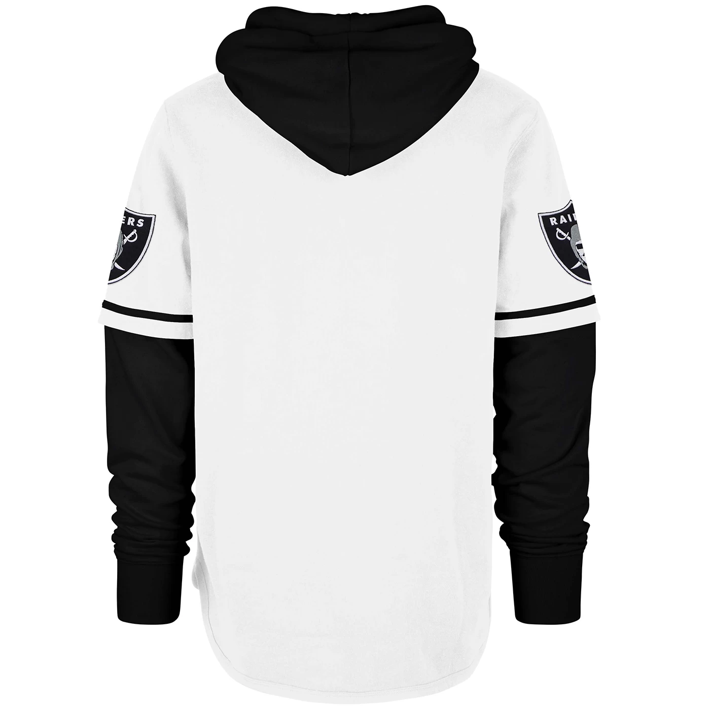 The Raiders ’47 Trifecta Shortstop Pullover Hood has a uniform-inspired silhouette with a contrast-colored hood and sleeves to give you a layered look. Designed with midweight fleece and a soft brushed interior this hoodie features team wordmark and shield logo twill appliques across the chest and on each sleeve so your team pride is on display. 80% cotton 20% polyester.