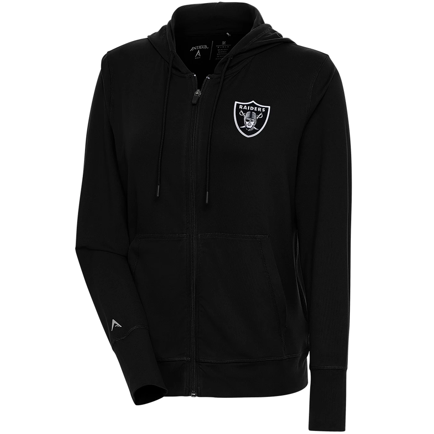 The Raiders Antigua Moving Full-Zip Hood is designed with brushed jersey fabrication for an ultra-soft feel. Features silicone tipped drawcords and a team shield logo at upper left chest to make you stand out in the crowd! 88% polyester 12% spandex.