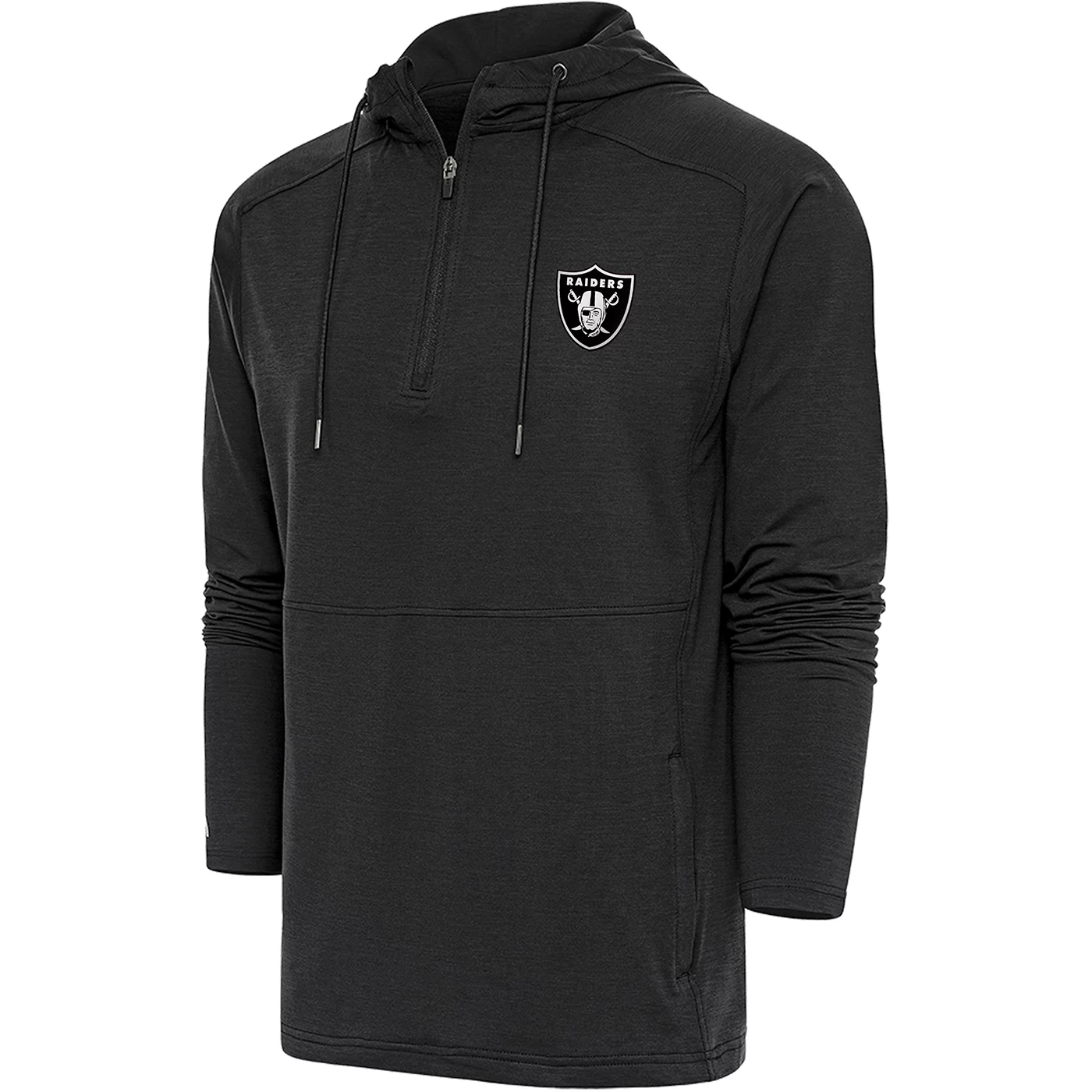 The Raiders Antigua Spikes Quarter Zip is designed with brushed heather jersey slub fabrication that is extremely soft and comfortable. This hooded quarter zip has a corded drawcord double pockets and zipper garage and features a team shield logo at upper left chest. 88% polyester 12% spandex.