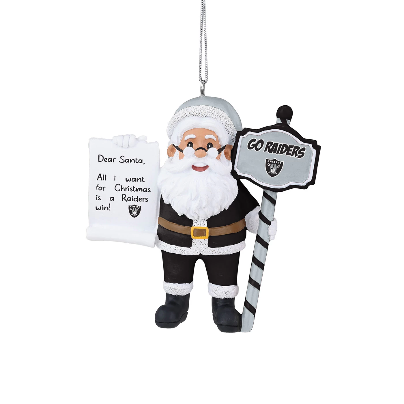 Make a wish this holiday season! The Raiders Santa With Scroll Ornament by FOCO features a Santa figurine dressed in team colors and holding a sign and scroll rooting for a Raiders W. Measures approximately 3″ x 3″ and comes ready to hang.