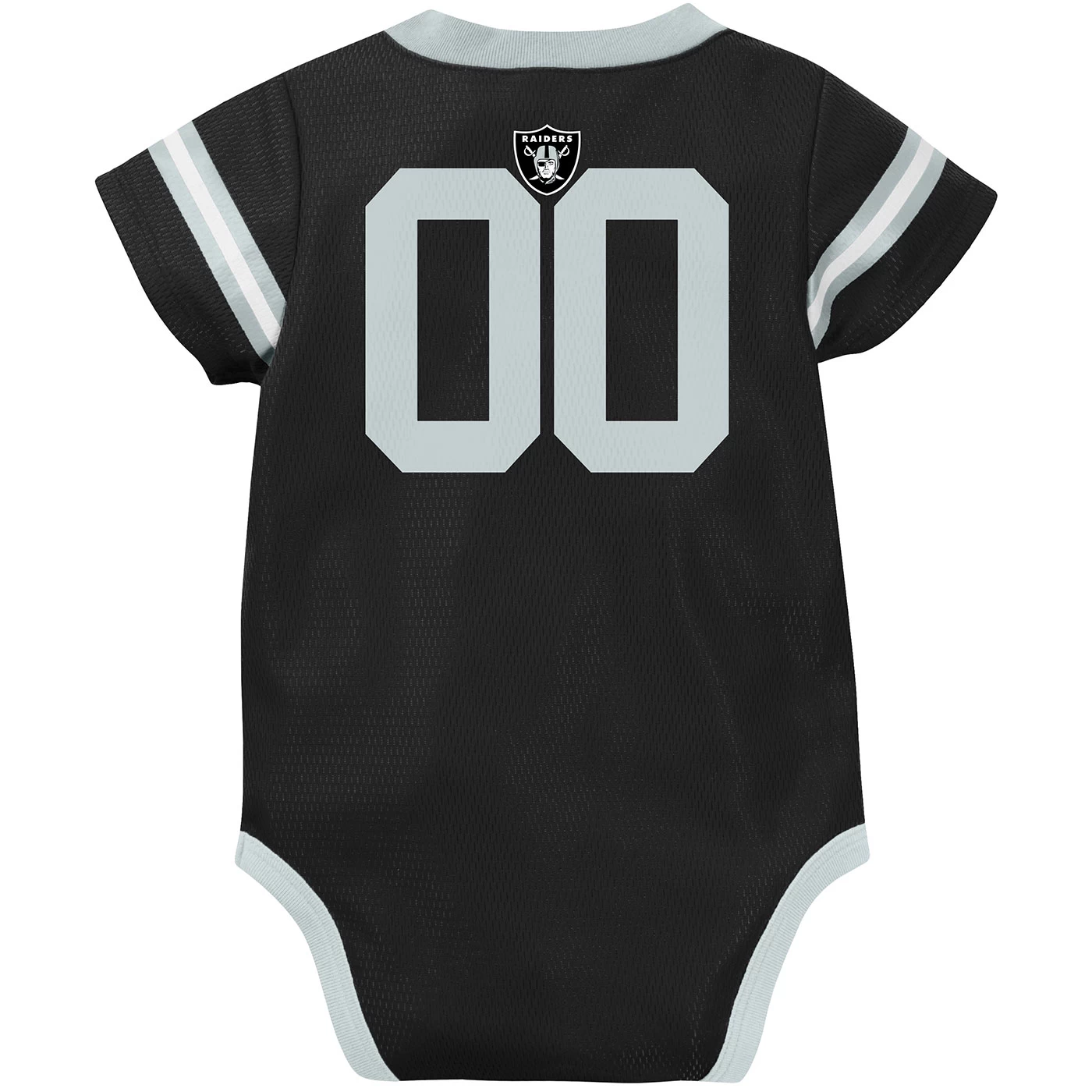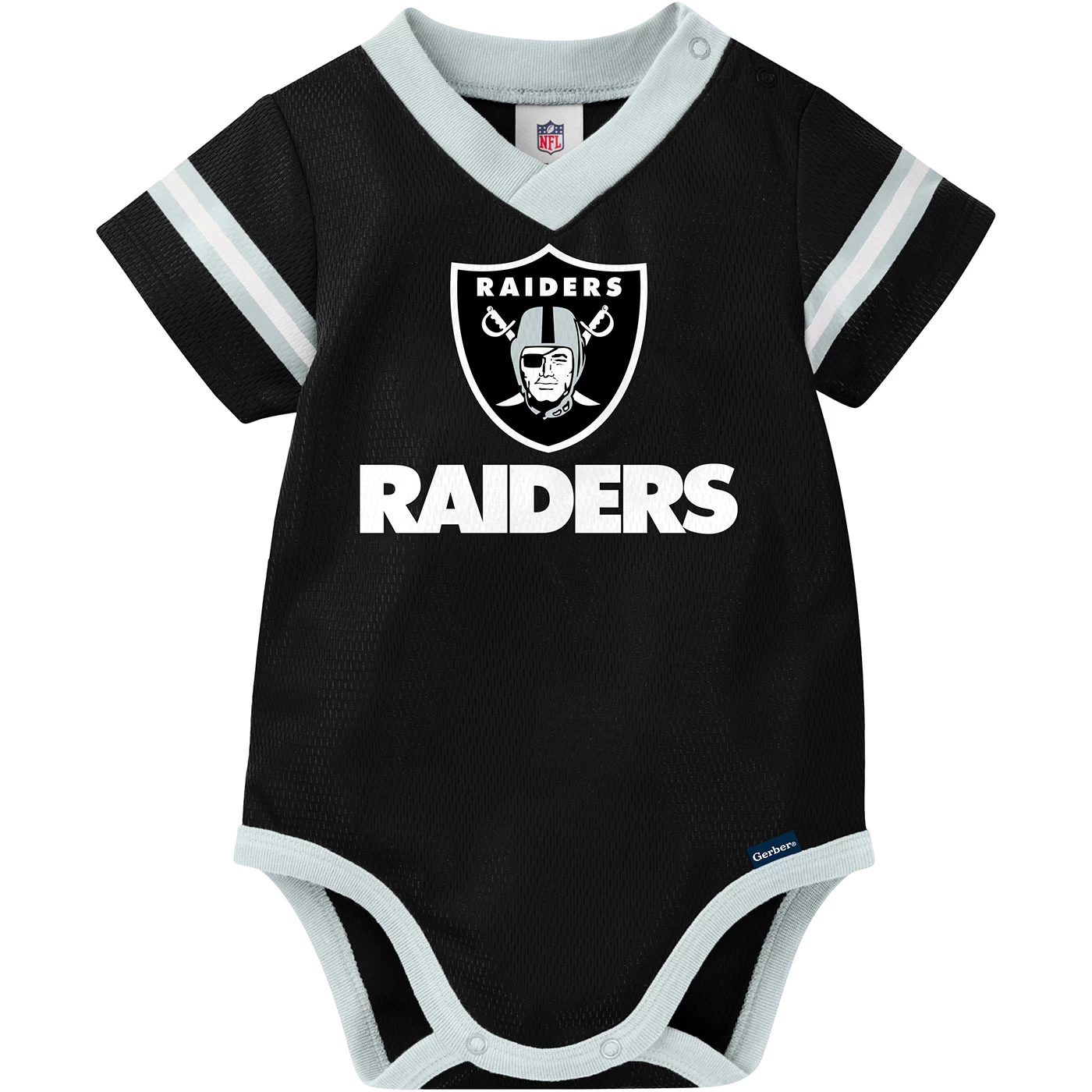 Ready for the end zone! The Raiders Dazzle Newborn Bodysuit by Gerber provides a jersey-like look with screen printed graphics on the front and back. Snap closure at the crotch and shoulder.