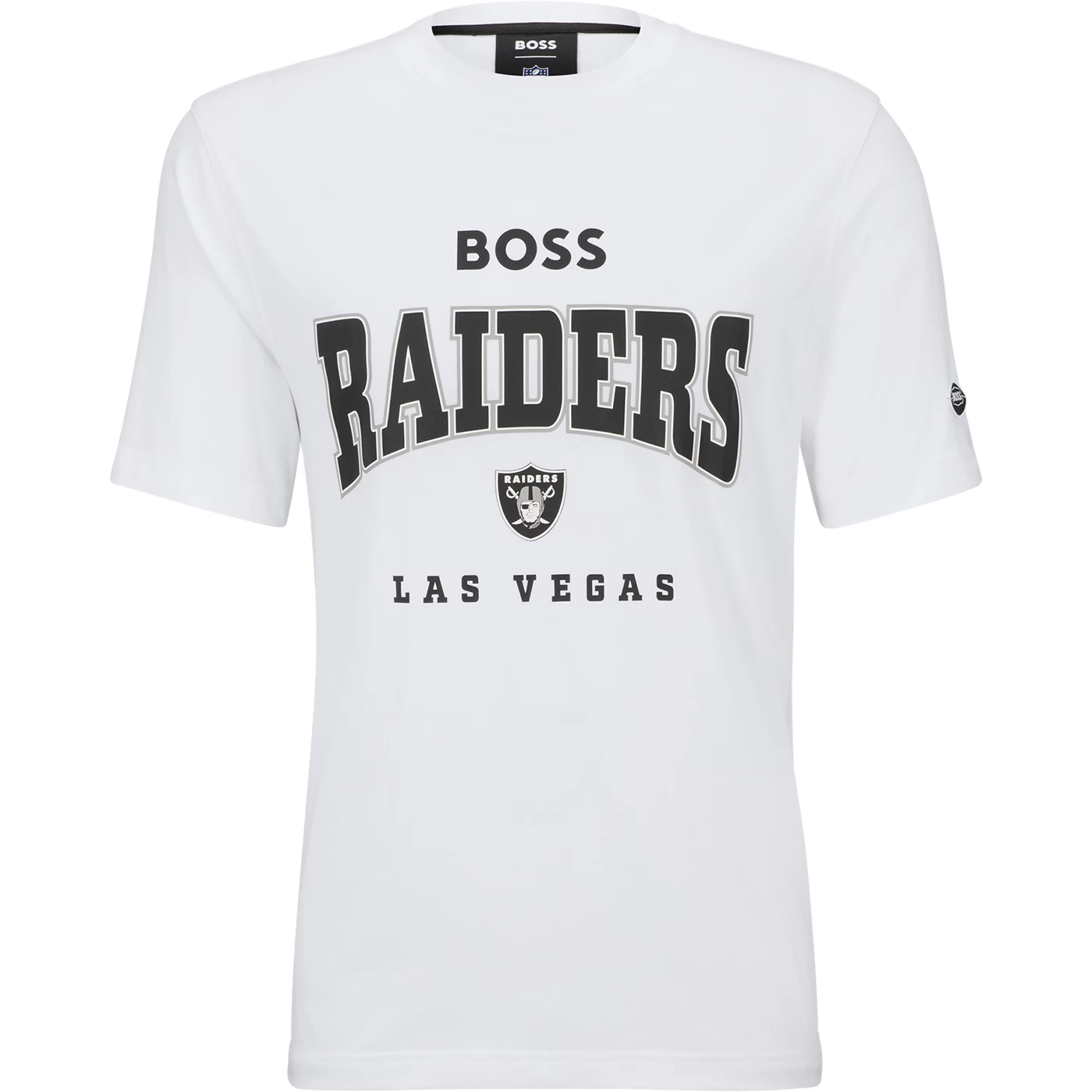 Sport elevated athleisure with this limited edition BOSS x Raiders collection! The black Raiders Hugo Boss Huddle Tee is designed with sporty stretch cotton-blend fabrication for premium comfort. This crewneck tee features rubberized heat-sealed “Raiders” applique and additional team and BOSS print detailing across the chest. Small rubberized official league and BOSS logos at upper back. 94% cotton 6% elastane.