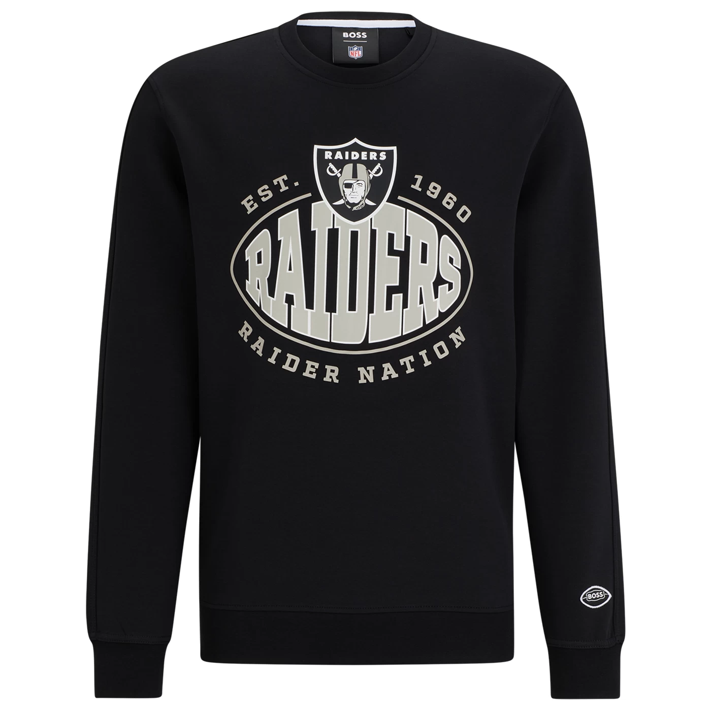 Sport elevated athleisure with this limited edition BOSS x Raiders collection! The Raiders Hugo Boss Muff Crew is designed with thick soft fabrication and lining for premium comfort. This crewneck has an elastic waistband and cuffs plus a rubberized heat-sealed team applique across the chest and additional BOSS print detailing across the upper back. 73% cotton 23% polyester 4% elastane.