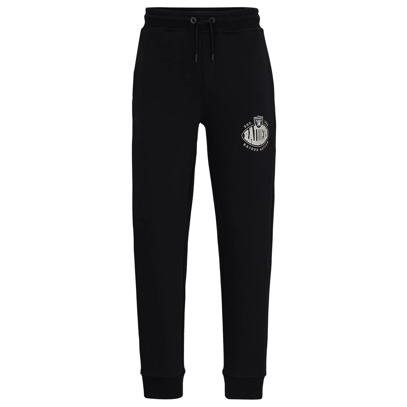 Sport elevated athleisure with this limited edition BOSS x Raiders collection! The Raiders Hugo Boss Sack Sweatpants are designed with a drawstring waistband and thick soft fabrication and lining for premium comfort. These pants have one rear pocket and two on seam pocks and feature rubberized heat-sealed team applique at the upper left leg and additional BOSS print detailing on the back pocket. 73% cotton 23% polyester 4% elastane.
