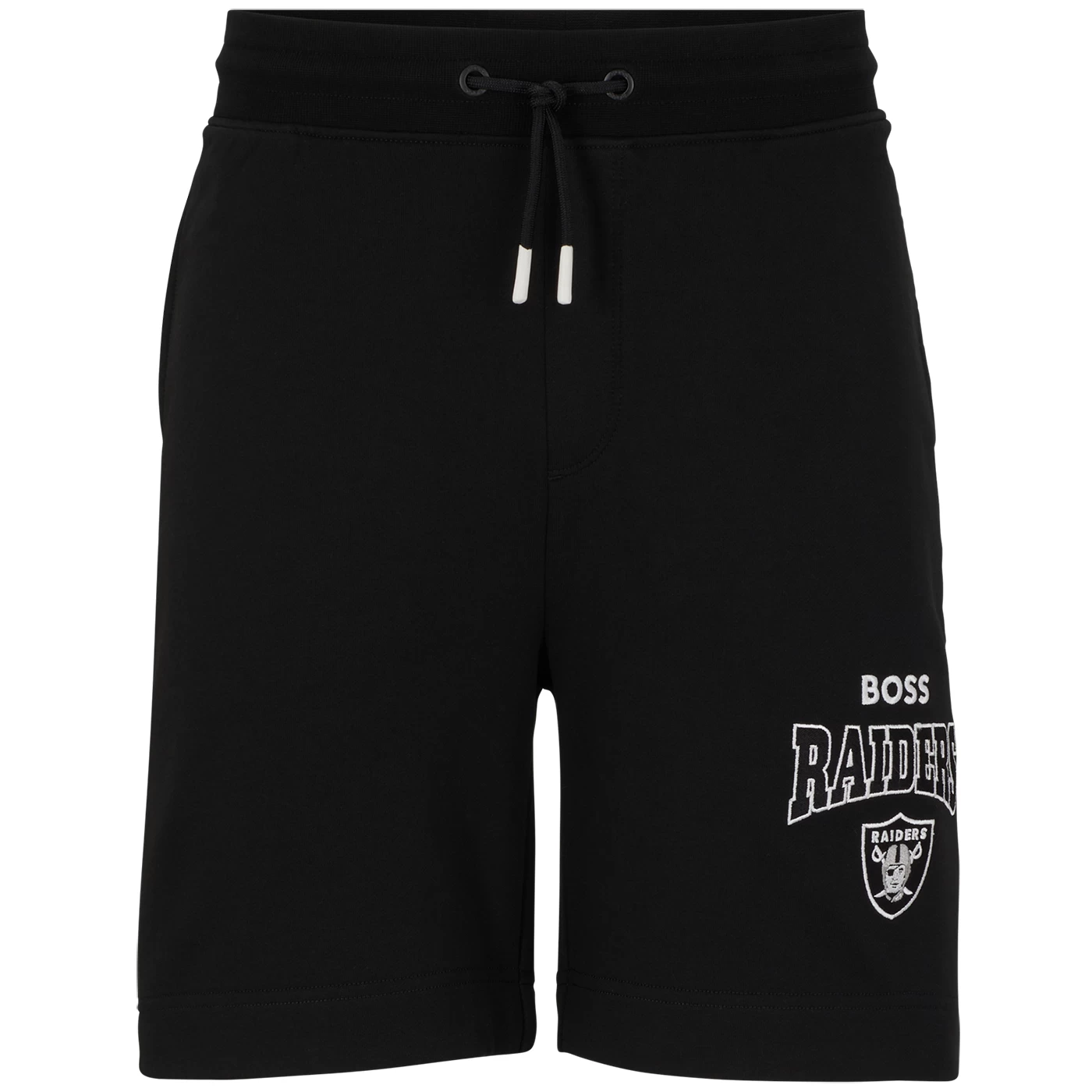 Sport elevated athleisure with this limited edition BOSS x Raiders collection! The Raiders Hugo Boss Sweat Shorts are designed with an elastic waistband and soft French terry cotton fabrication and lining for premium comfort. These drawstring shorts have one rear pocket and two side pocks and feature embroidered team and BOSS detailing at the lower left leg. Inseam on size M measures approximately 6.5″. 100% cotton.