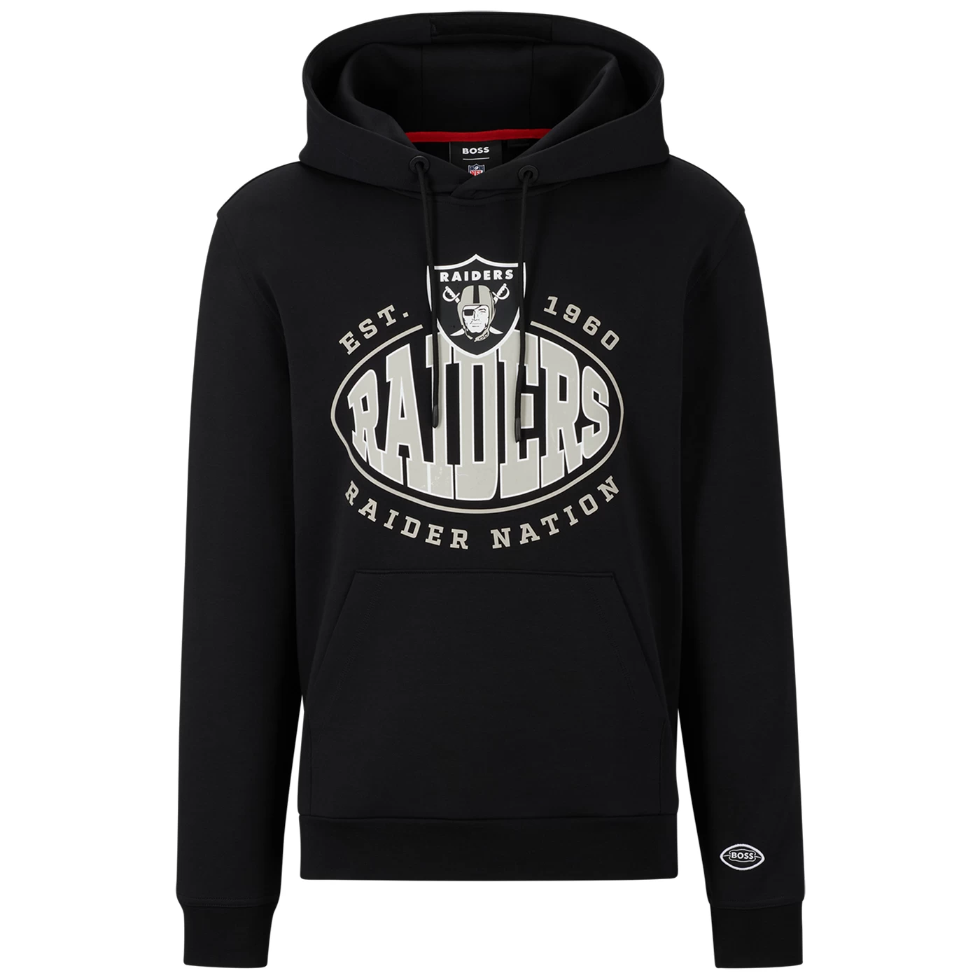 Sport elevated athleisure with this limited edition BOSS x Raiders collection! The Raiders Hugo Boss Touchback Pullover Hood is designed with thick soft fabrication and lining for premium comfort. This crewneck has an elastic waistband and cuffs plus a rubberized heat-sealed team applique across the chest and additional BOSS print detailing across the upper back. 73% cotton 23% polyester 4% elastane.