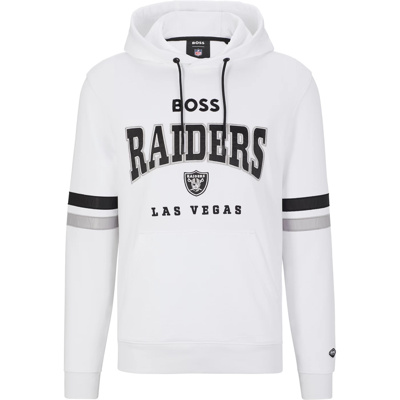 Sport elevated athleisure with this limited edition BOSS x Raiders collection! The white Raiders Hugo Boss Touchdown Pullover Hood is designed with midweight French terry cotton fabrication and lining for premium comfort. This hoodie has ribbed cuffs and team-colored striped fabric appliques at the sleeves plus embroidered team and BOSS detailing across the chest. Small rubberized official league and BOSS logos at upper back. 100% cotton.