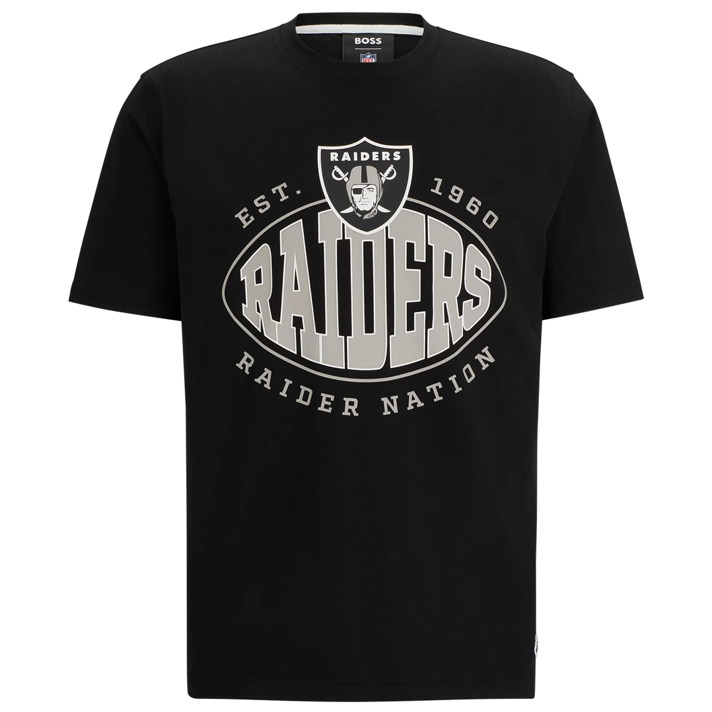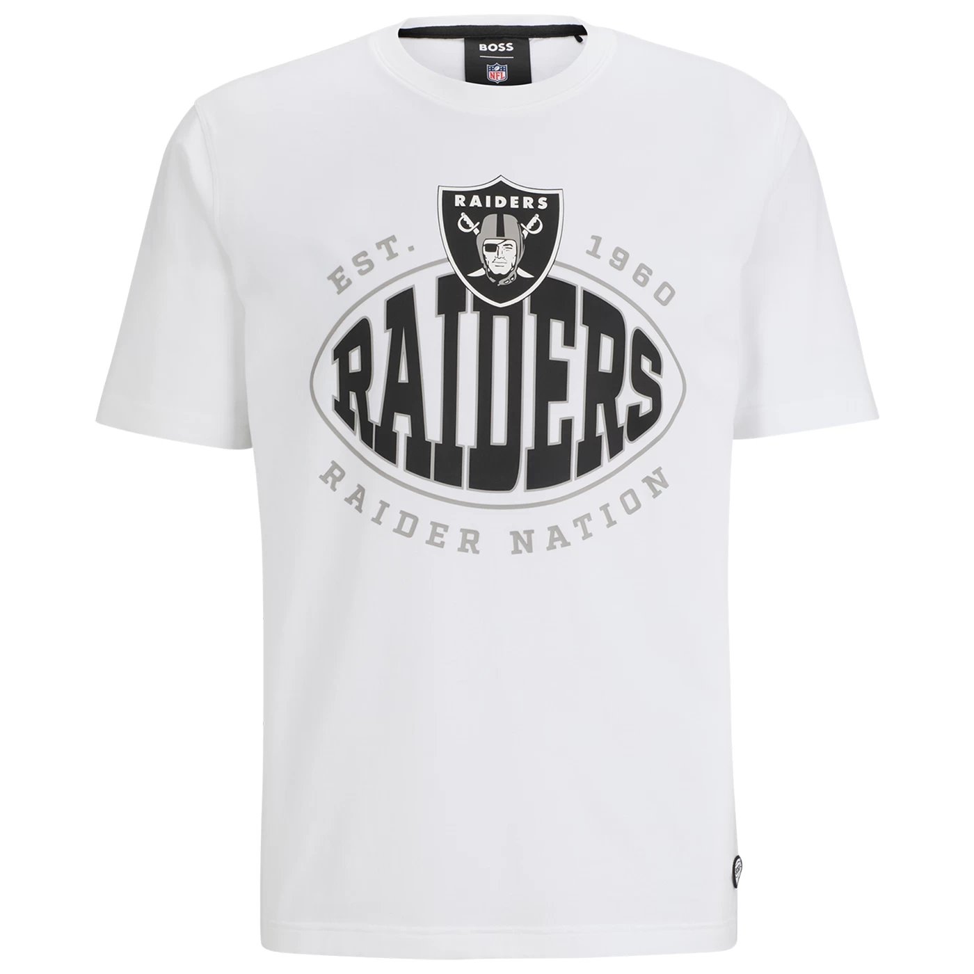 Sport elevated athleisure with this limited edition BOSS x Raiders collection! The Raiders Hugo Boss Trap Tee is designed with sporty stretch cotton-blend fabrication for premium comfort. This crewneck tee features rubberized heat-sealed team applique across the chest and additional BOSS print detailing across the upper back. 94% cotton 6% elastane.