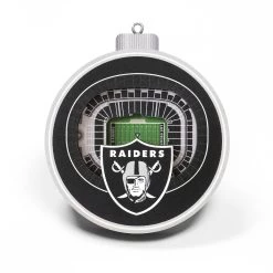 Bring Allegiant Stadium home for the holidays! The Las Vegas Raiders 3D Stadium Ornament by YouTheFan features team graphics printed on both sides. 3D stadium graphic stacked 3 rows deep. Measures approximately 3″ x .5″ x 5.25″.
