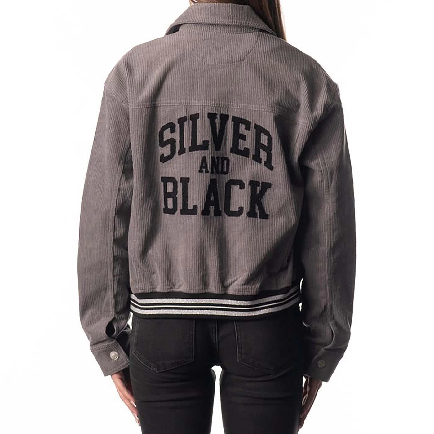 Rep the Silver and Black! The Las Vegas Raiders Corduroy Shacket by The Wild Collective is designed with team colored striped ribbing at the waistband and a front button closure. This cropped shacket features a team shield logo embroidered at the upper left chest pocket and “Silver and Black” embroidery across the back.