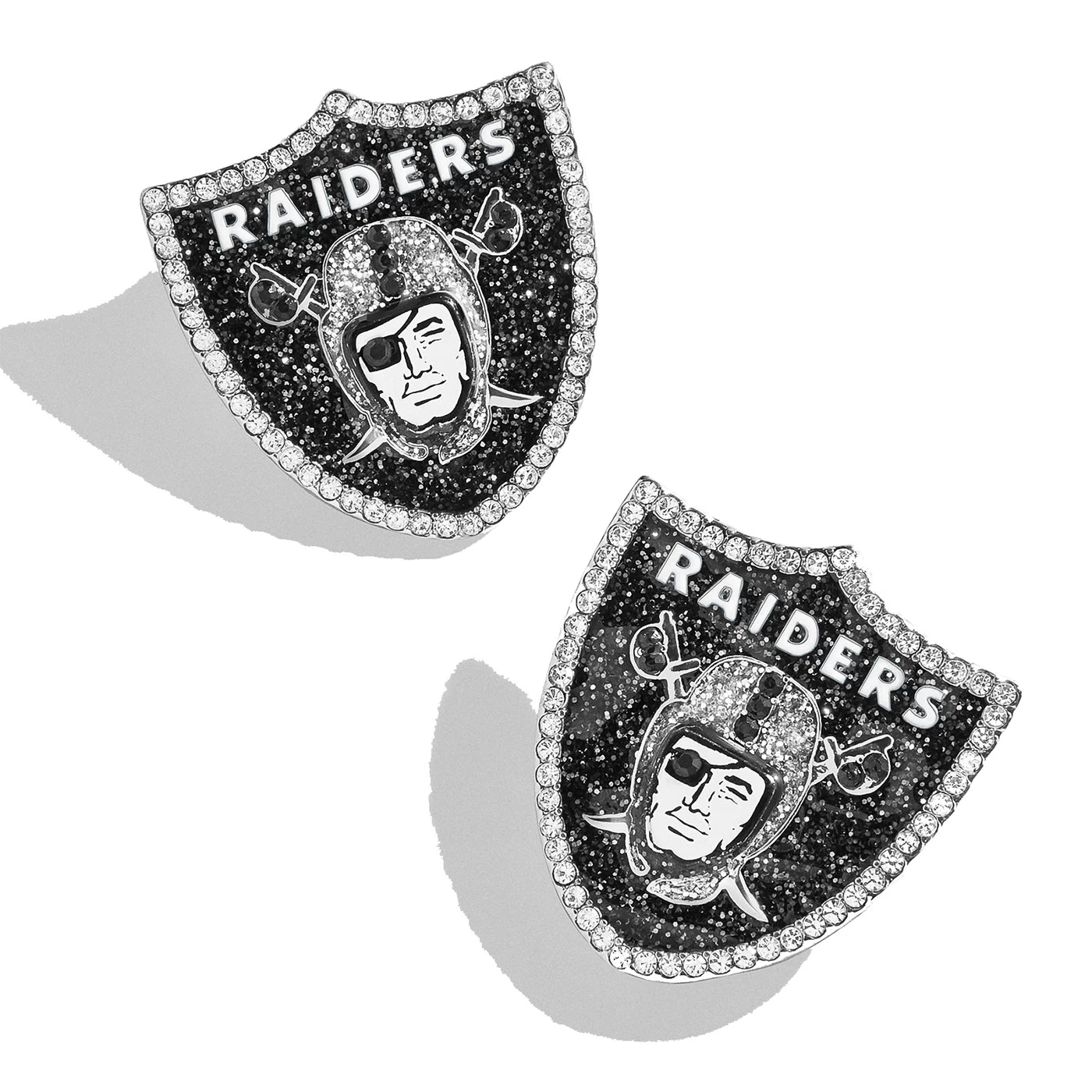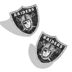 Elevate your gameday accessories! The Las Vegas Raiders Statement Studs by Baublebar feature a glitter enamel Raiders shield logo and have a post backing. Outlined with crystal pave stones these earrings are hypoallergenic. Measure approximately 1″ x 0.85″.