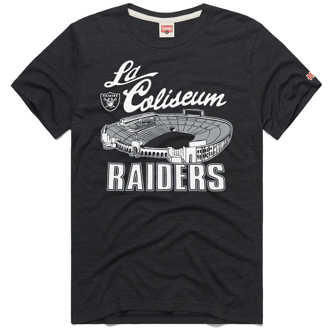 Honor your team’s history! The heathered unisex Los Angeles Coliseum Raiders Tee by Homage has a relaxed fit and features LA Coliseum graphics printed across the body. Polyester cotton and rayon blend.