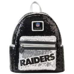 Keep your essentials on hand with the Raiders Sequin Mini Backpack by Loungefly. This backpack is designed with faux leather and has adjustable shoulder straps to maximize comfort. Interior lining features repeat team logo print while the exterior is decorated with all-over sequins and a team wordmark logo patch. Measures approximately 9″ x 10.5″ x 4.5″.