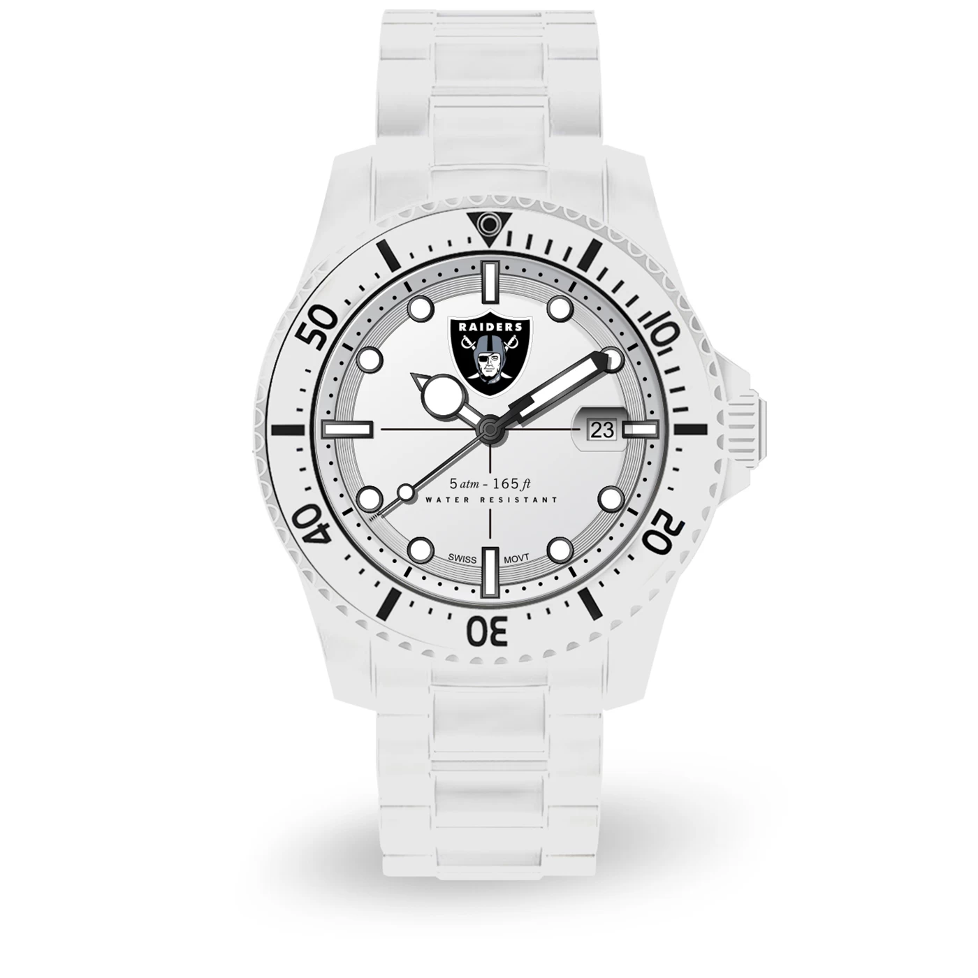 Complete your elevated look with this sleek piece! The Raiders Men’s Limited Edition Ceramic Watch by Game Time is designed with a Swiss movement and limited edition numbered caseback. This surgical grade stainless steel watch features a white ceramic dial with date window plus a Raiders team shield logo embellishment.