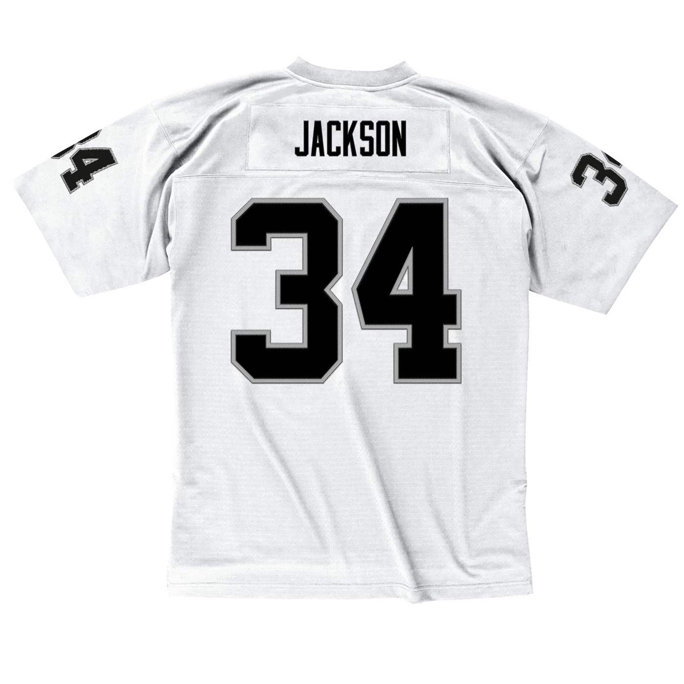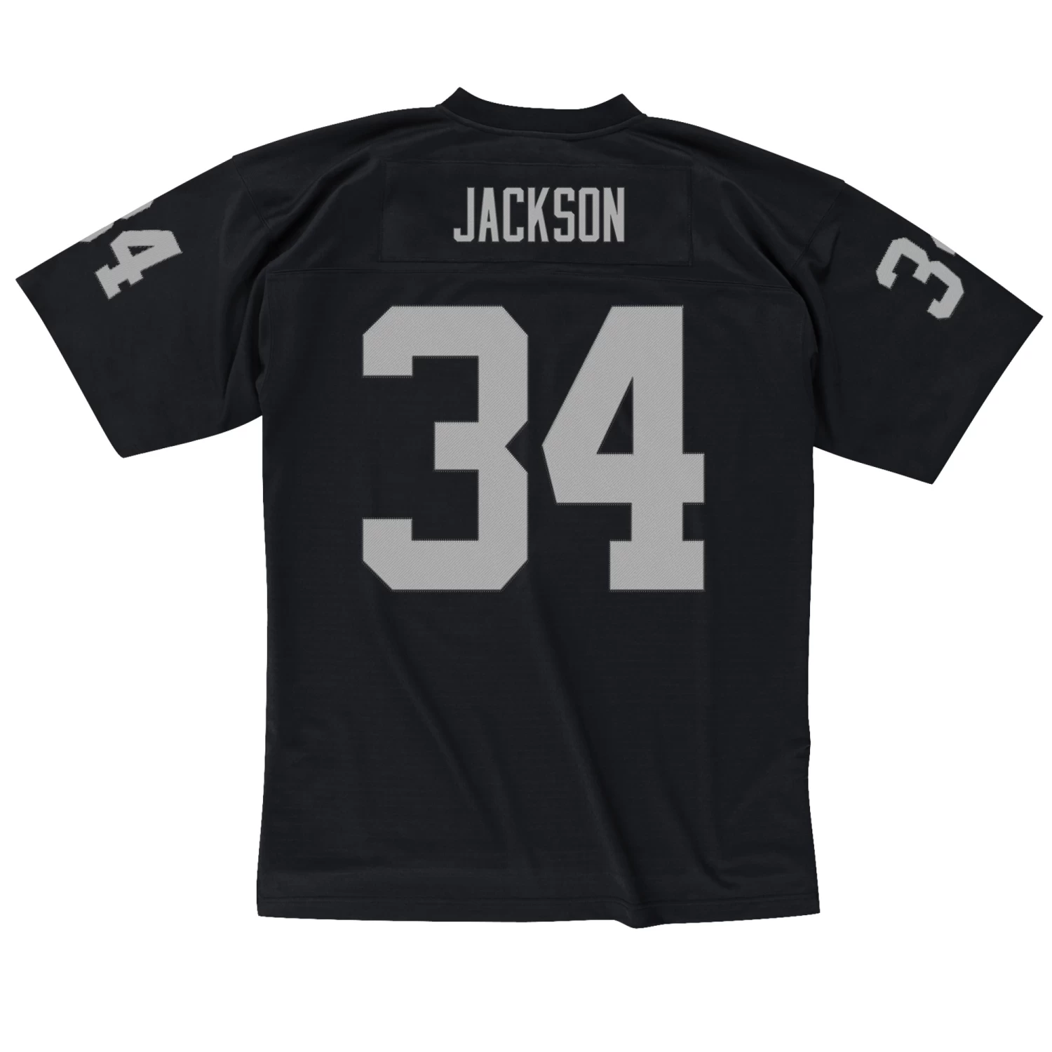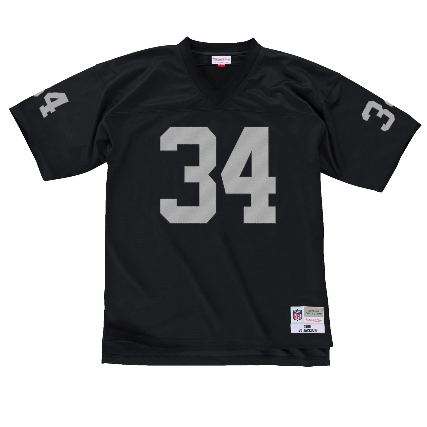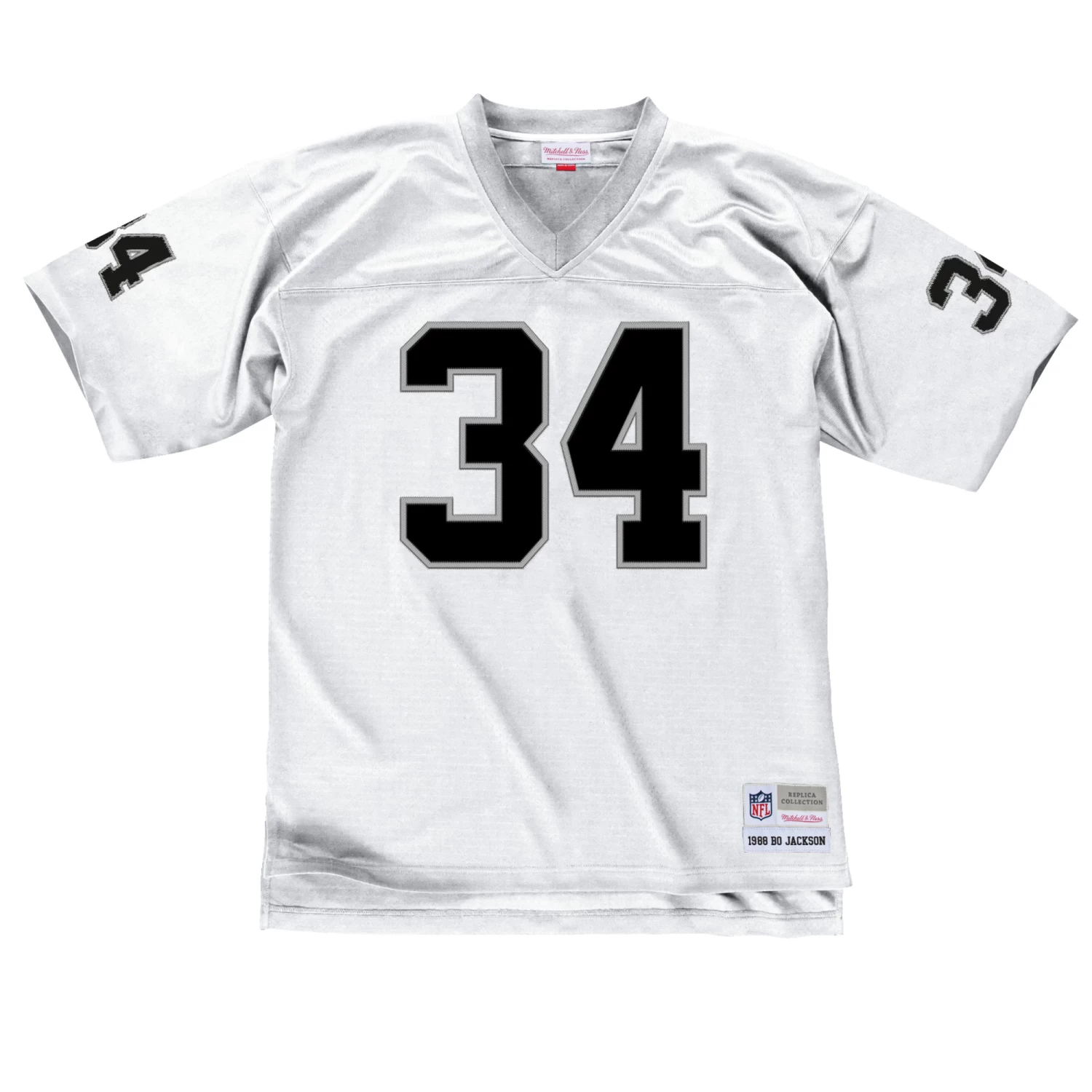 Celebrate a Raiders legend with the Mitchell & Ness Bo Jackson 1988 Legacy Jersey. This replica jersey is made of polyester mesh with a droptail hem side slits and a ribbed knit v-neckline. It is embellished with twill name and numbers at the chest back and sleeves. Embroidered felt name/year ID patch and Mitchell & Ness jock tag on lower left front. 100% polyester.