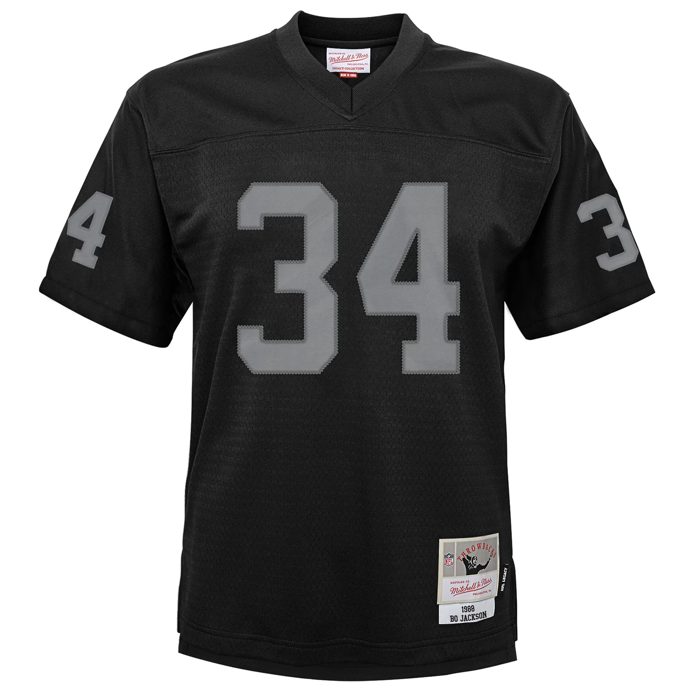 Celebrate a Raiders legend with the Mitchell & Ness Bo Jackson 1988 Youth Legacy Jersey. This replica jersey is made of polyester mesh with a droptail hem side slits and a ribbed knit v-neckline. It is embellished with twill name and numbers at the chest back and sleeves. Embroidered felt name/year ID patch and Mitchell & Ness jock tag on lower left front. 100% polyester.