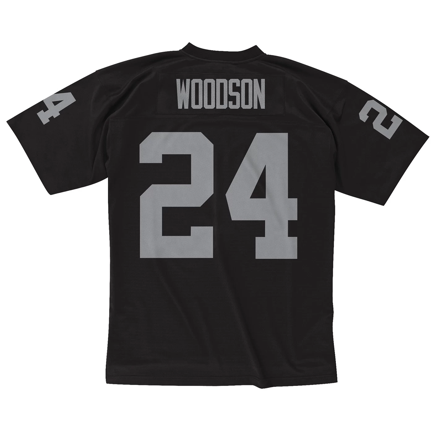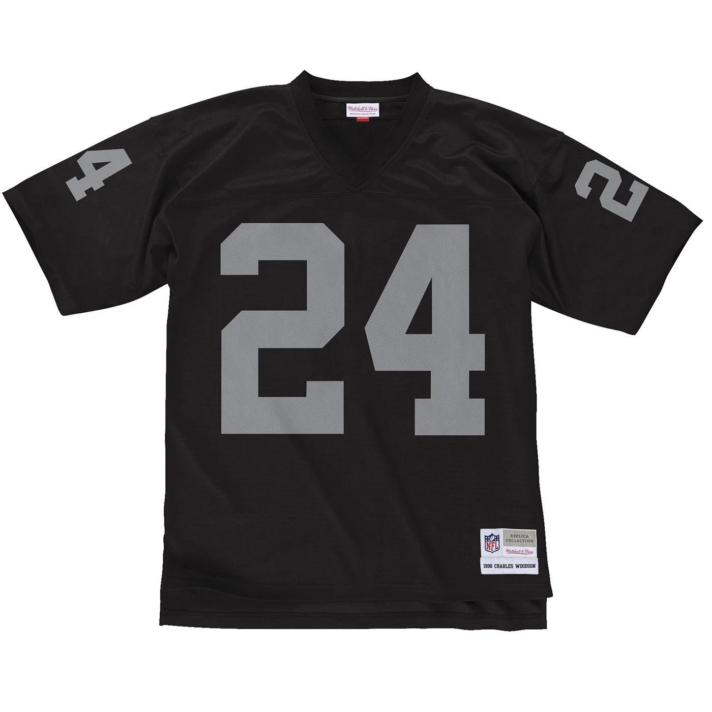 Celebrate a Raiders legend with the Mitchell & Ness Charles Woodson 1998 Legacy Jersey. This replica jersey is made of polyester mesh with a droptail hem side slits and a ribbed knit v-neckline. It is embellished with twill name and numbers at the chest back and sleeves. Embroidered felt name/year ID patch and Mitchell & Ness jock tag on lower left front. 100% polyester.