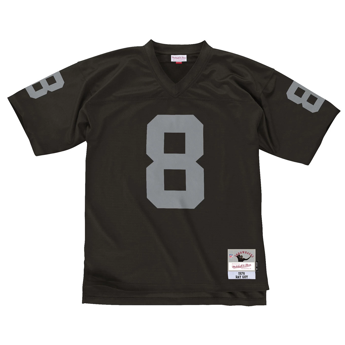 Celebrate a Raiders legend with the Mitchell & Ness Ray Guy 1976 Legacy Jersey. This replica jersey is made of polyester mesh with a droptail hem side slits and a ribbed knit v-neckline. It is embellished with twill name and numbers at the chest back and sleeves. Embroidered felt name/year ID patch and Mitchell & Ness jock tag on lower left front. 100% polyester.