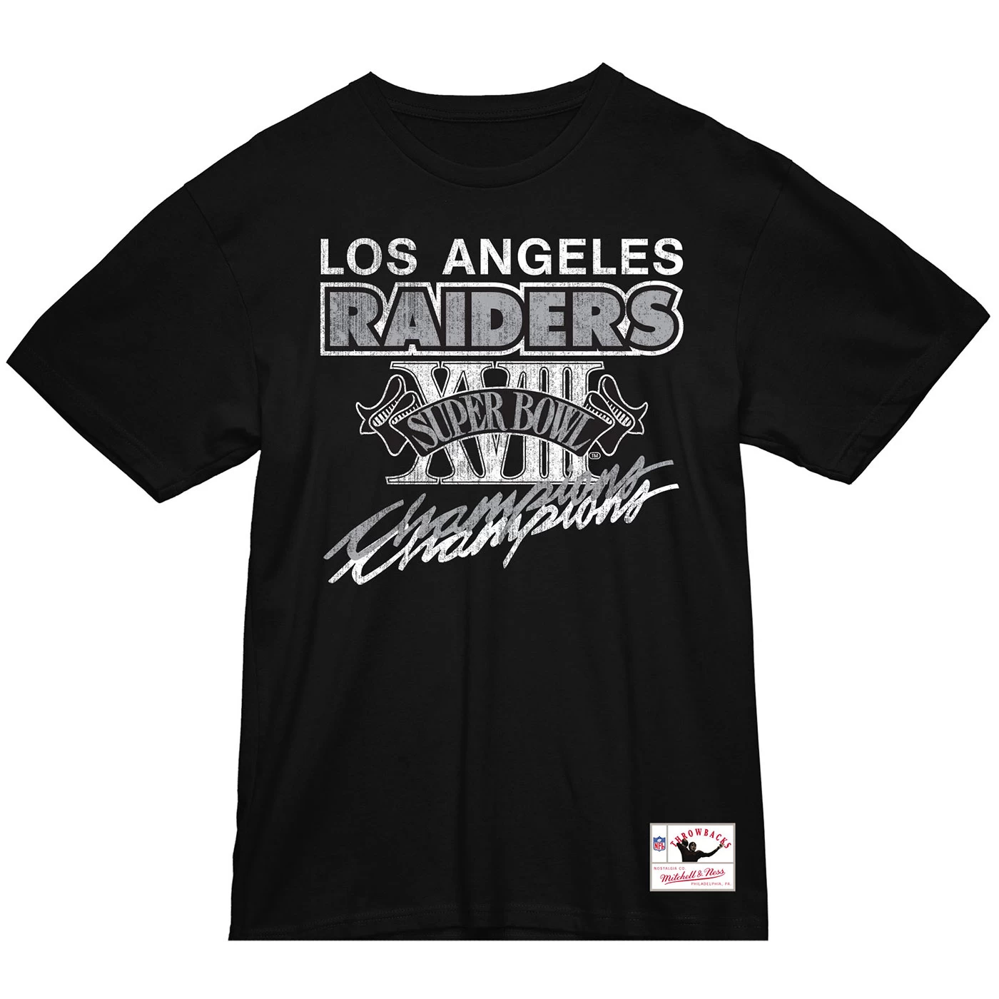 The Raiders Mitchell & Ness SBXVIII Los Angeles Raiders Tee is designed with premium cotton fabrication and features distressed Super Bowl XVIII Champions graphics printed across the body. Woven throwbacks jocktag at bottom left hem. 100% cotton.