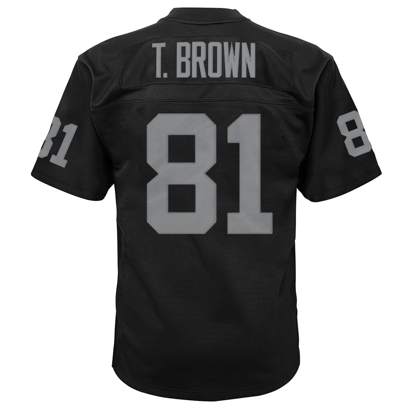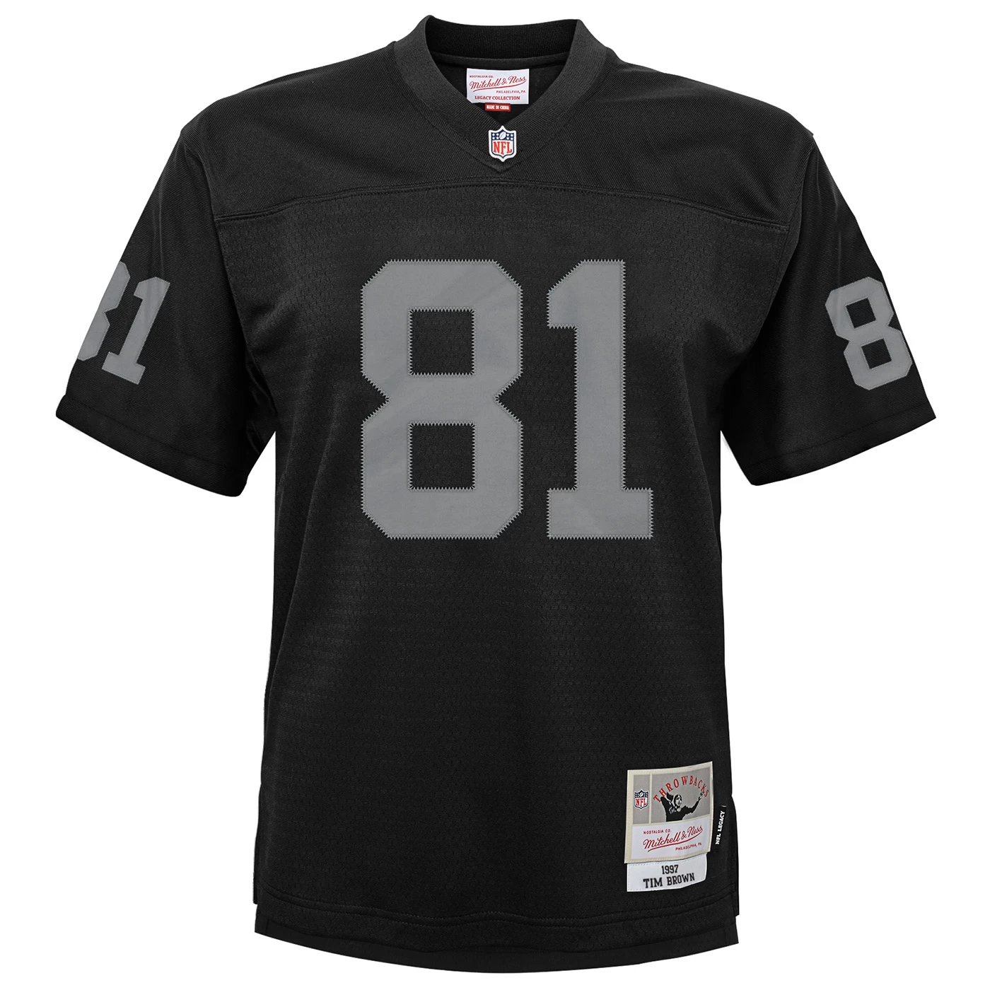 Celebrate a Raiders legend with the Mitchell & Ness Tim Brown 1997 Youth Legacy Jersey. This replica jersey is made of polyester mesh with a droptail hem side slits and a ribbed knit v-neckline. It is embellished with twill name and numbers at the chest back and sleeves. Embroidered felt name/year ID patch and Mitchell & Ness jock tag on lower left front. 100% polyester.