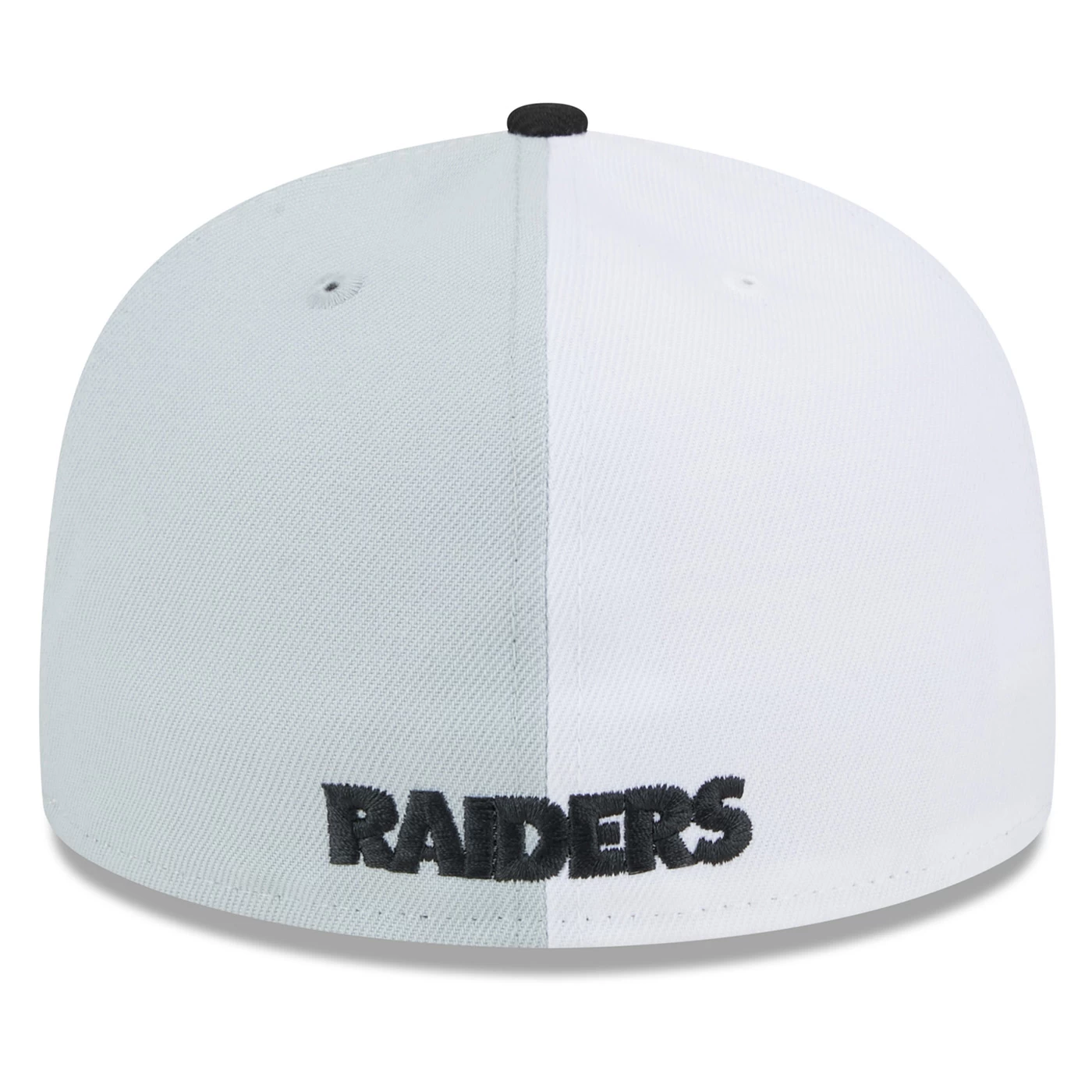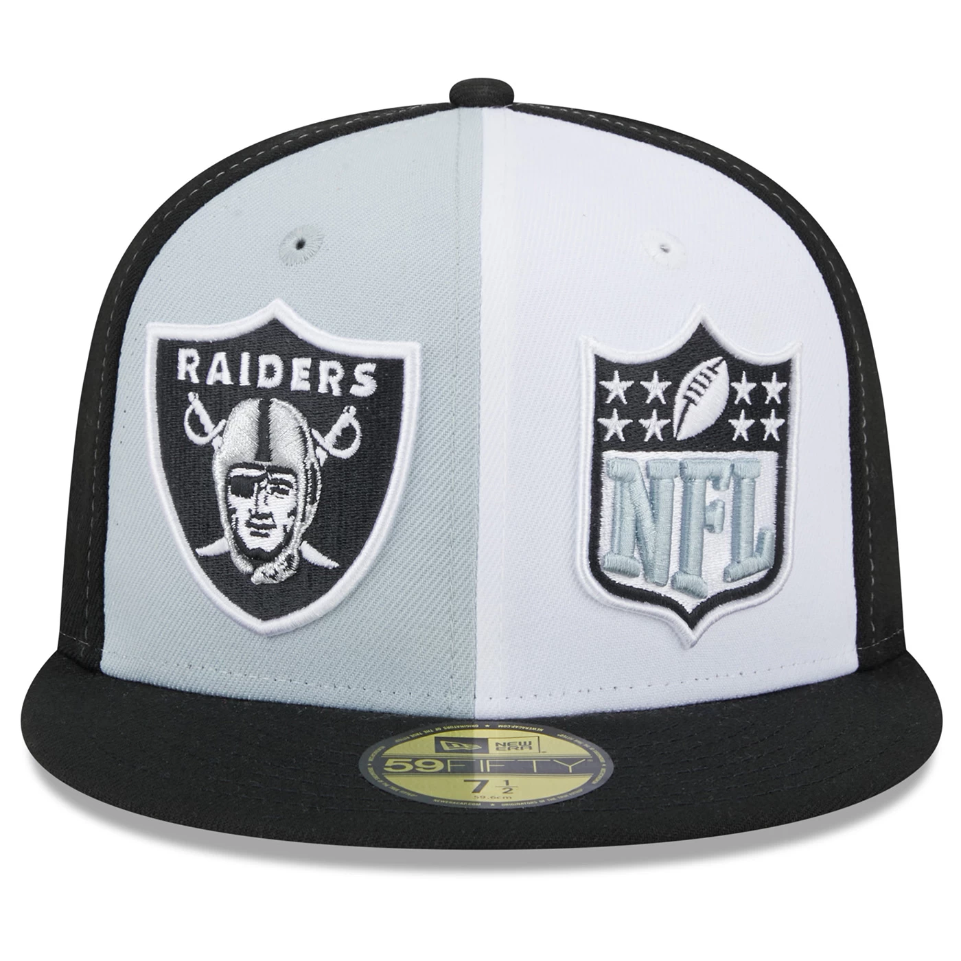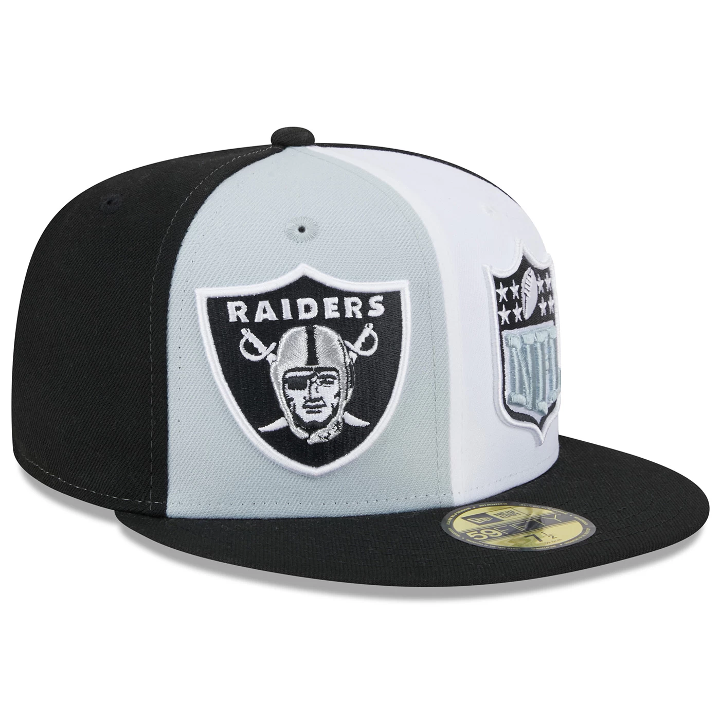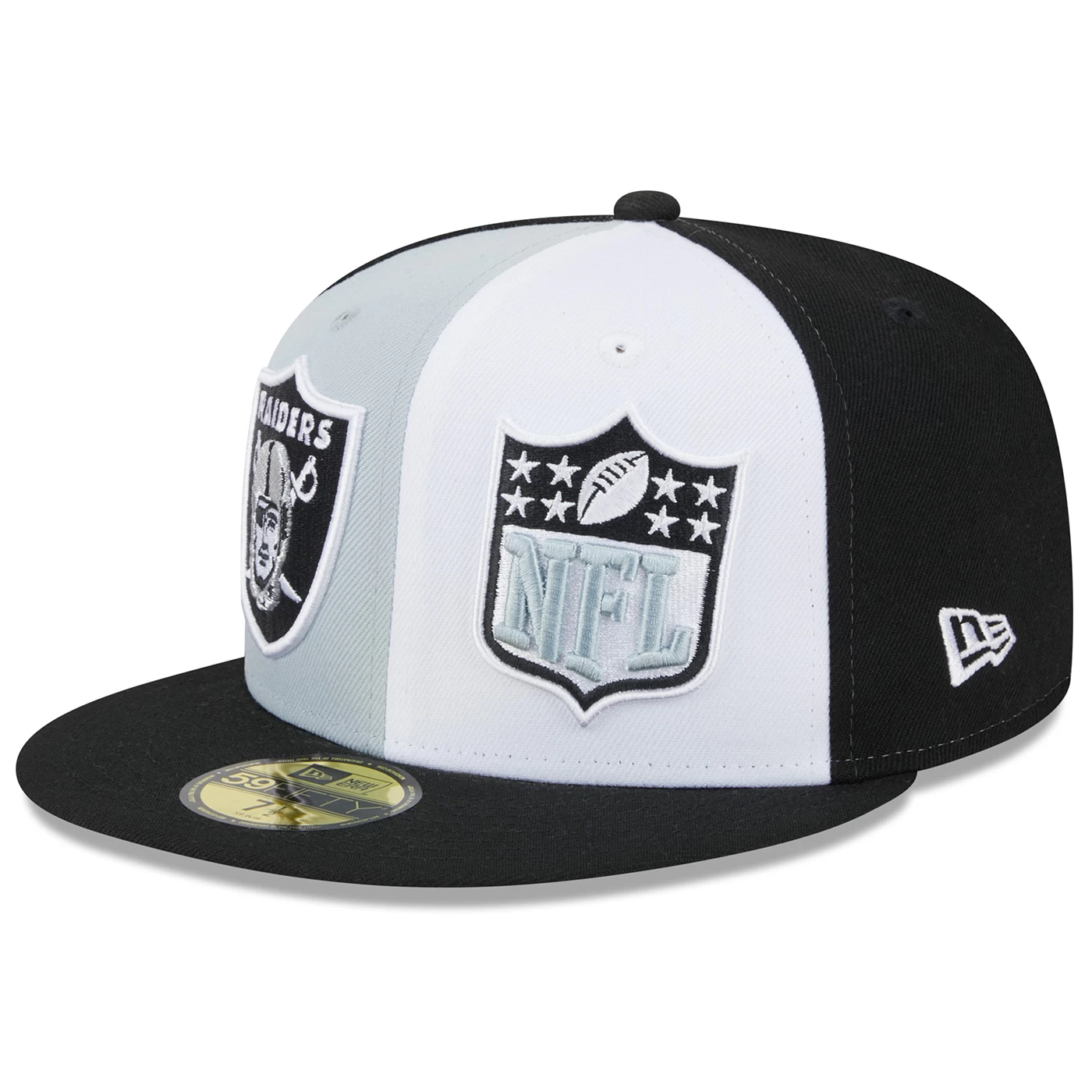 Support your favorite team in style at home and on the road! Suit up like the pros with the Raiders New Era 59Fifty Official 2023 NFL Sideline Cap. This fitted cap features an alternating team-colored visor and panels plus a team shield and official league logo embroidered at the front and team wordmark logo embroidered at the rear. 100% polyester.