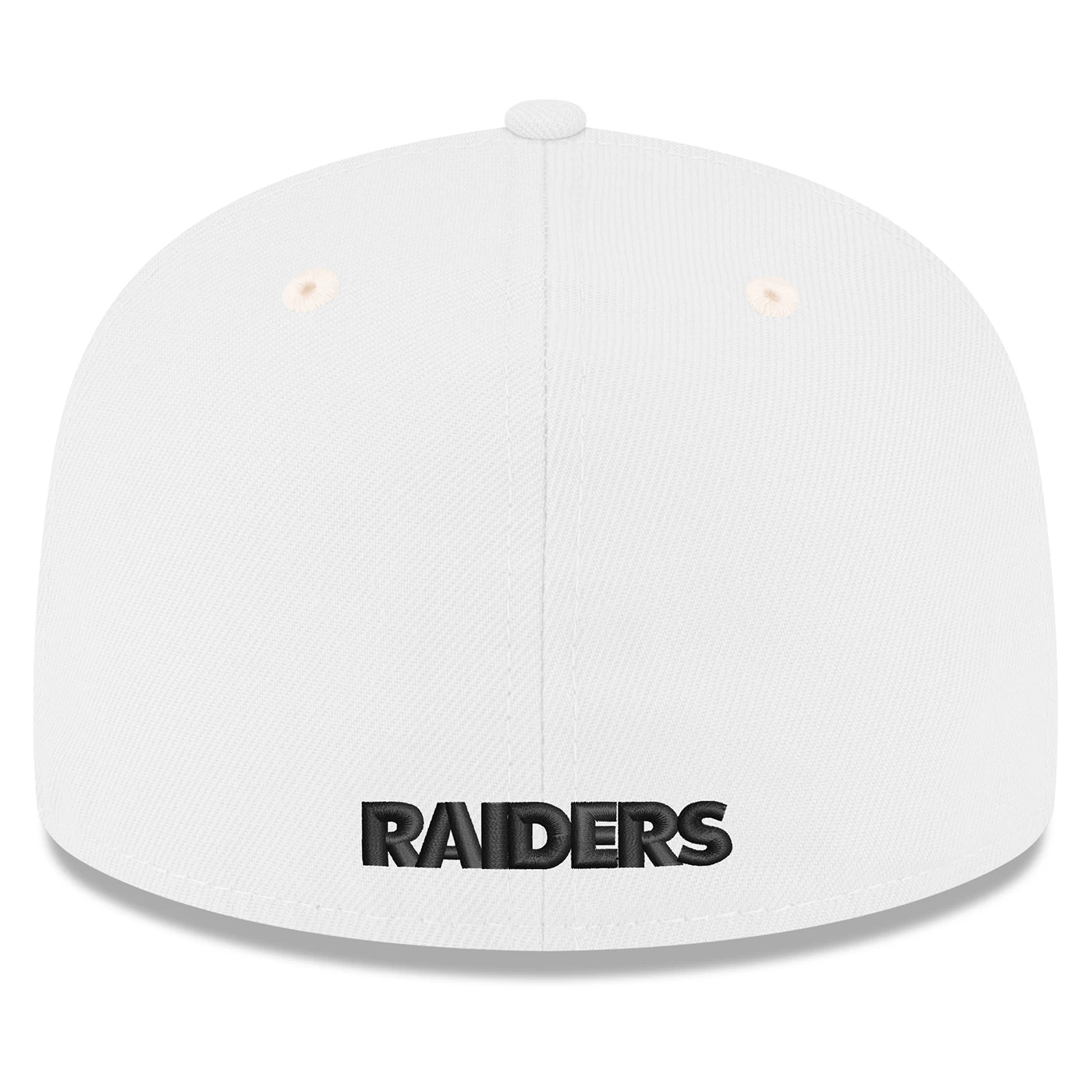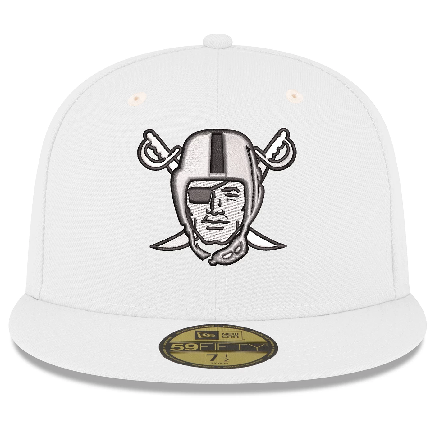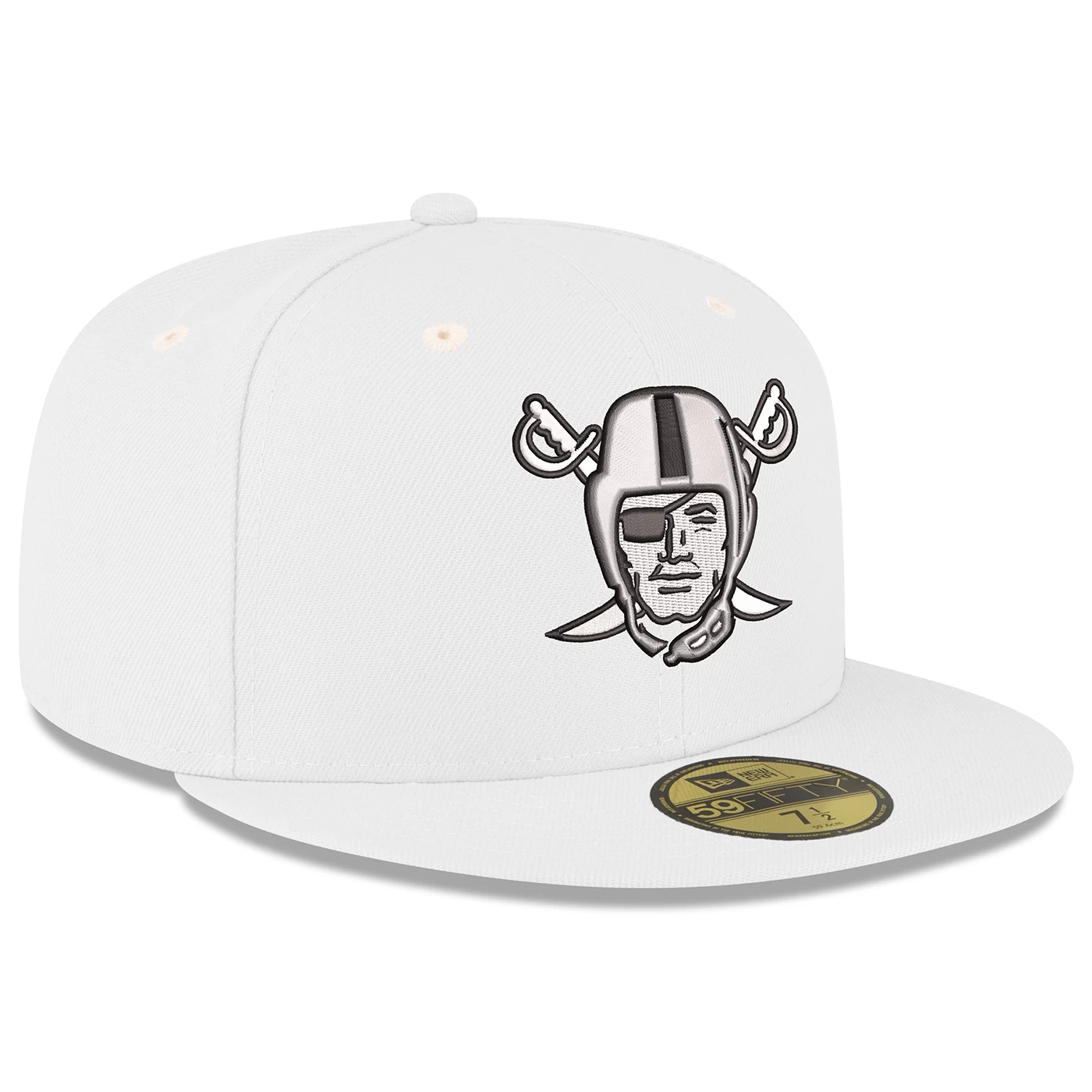 Rep your team with this Raider Image exclusive! The fitted Raiders New Era 59Fifty Pirate Logo White Cap features an embroidered team pirate logo across the front panels and team wordmark logo at the rear. Light gray undervisor. 100% polyester.