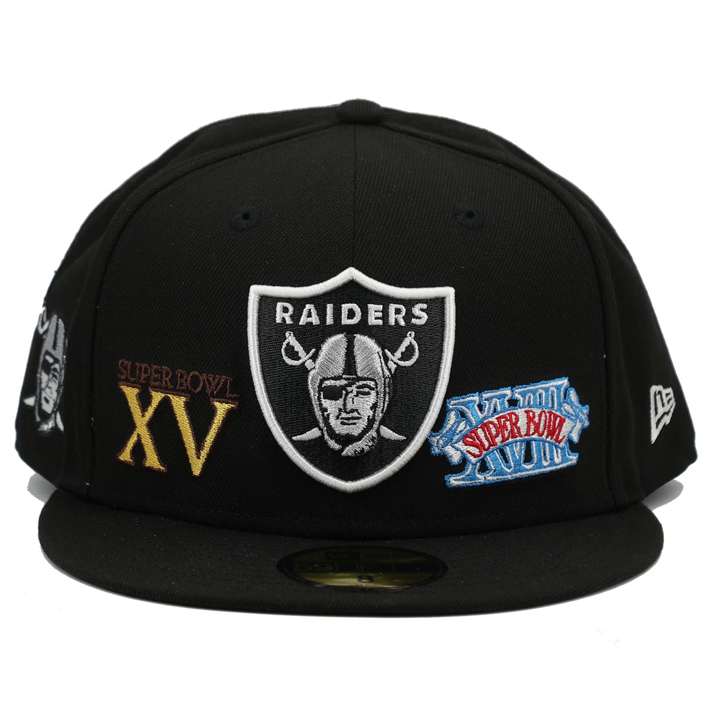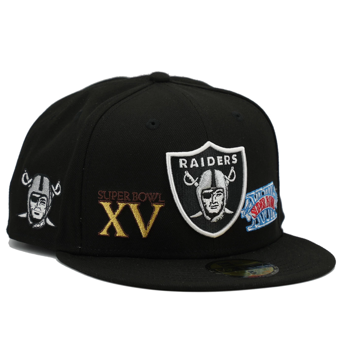 Rep a team exclusive! Designed just for fans the Raiders New Era 59Fifty Super Bowl Champions Cap features a team shield logo embroidered across the front panels with Super Bowl XI Super Bowl XV and Super Bowl XVIII embroidery around the crown. This fitted cap features an additional team pirate logo embroidered at the right-wear side. 100% polyester.