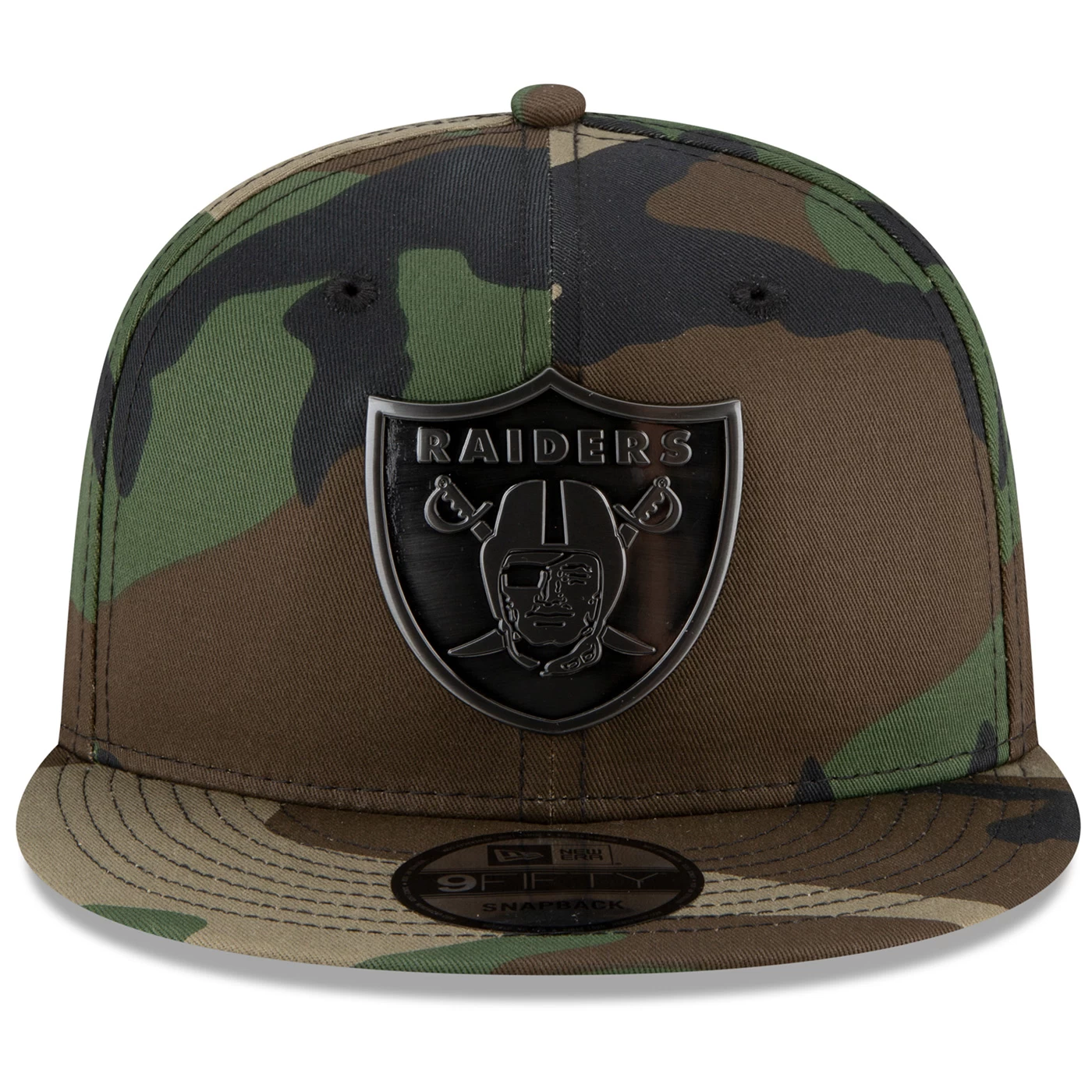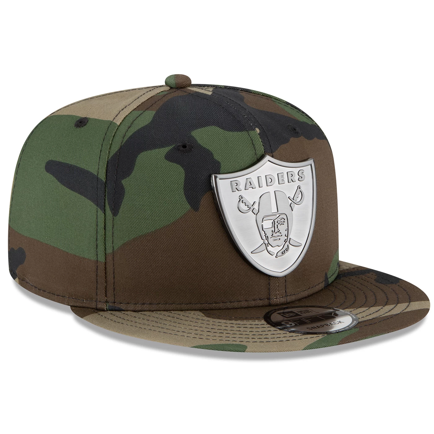 The Raiders New Era 9Fifty Brushed Metal Badge Cap is designed with all-over camo fabrication and features a team shield logo badge with a sleek brush metal finish across the front panels. Adjustable plastic snapback strap at the rear. 100% polyester.