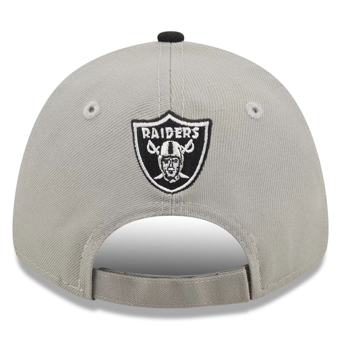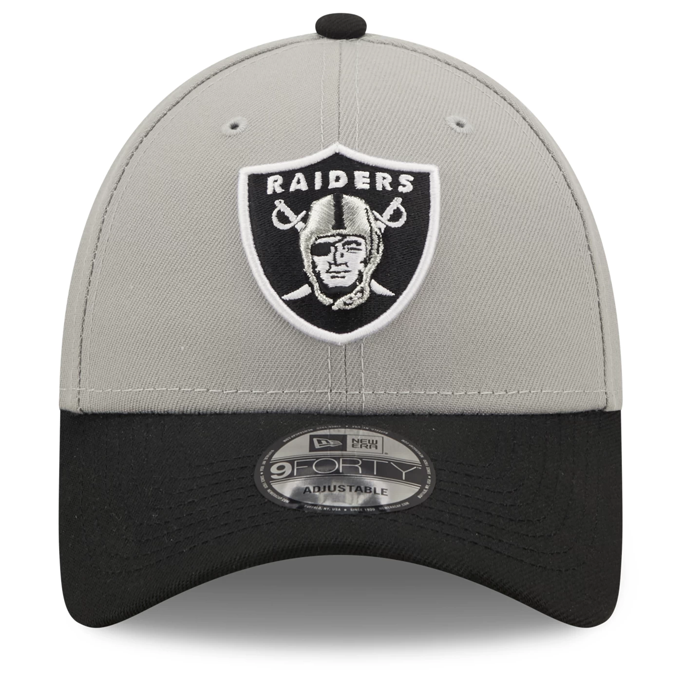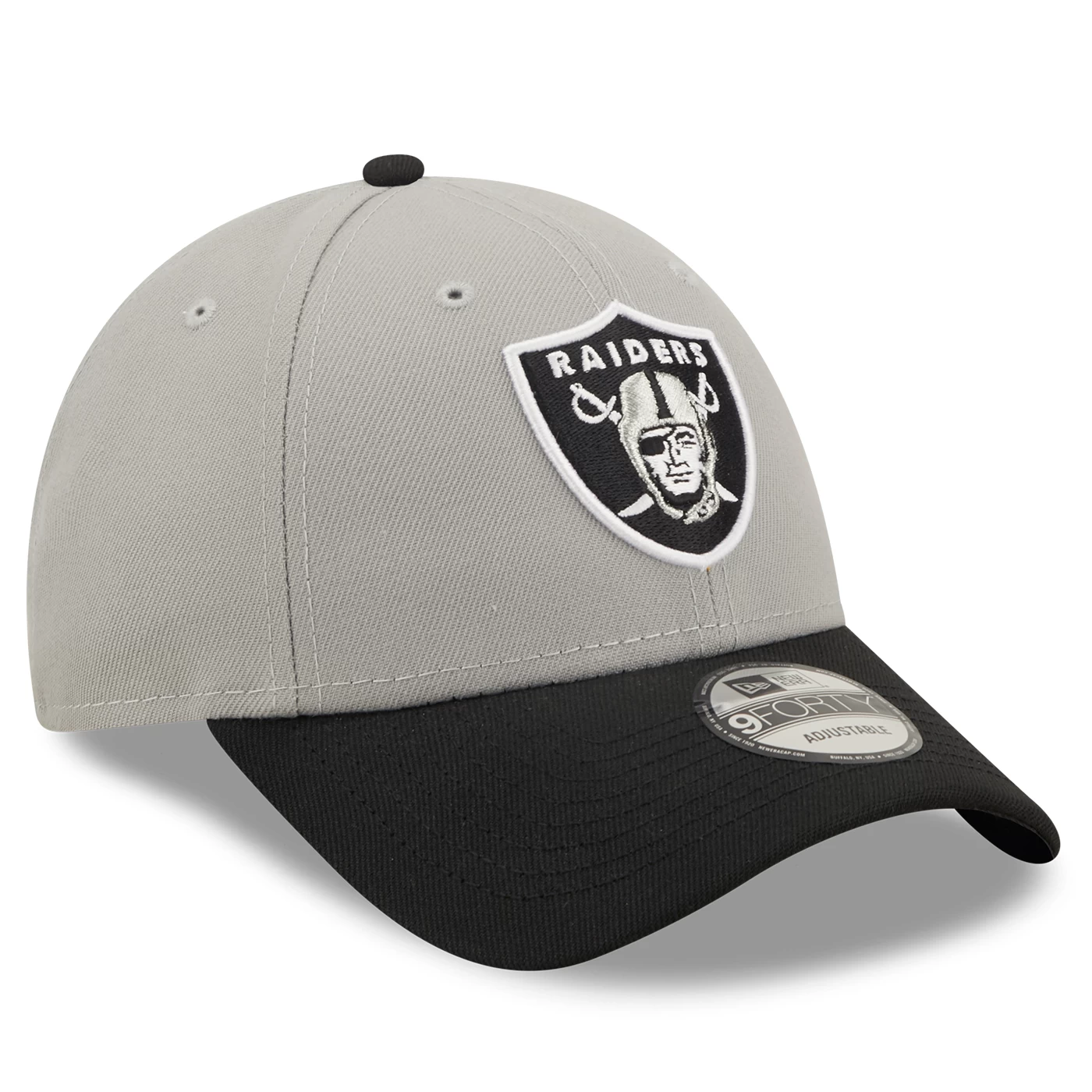 The Raiders New Era 9Forty The League Cap has a two-tone design with a gray crown and solid black visor. This cap features an embroidered team shield logo across the front and rear panels plus an adjustable Velcro strap at the rear. 100% polyester.