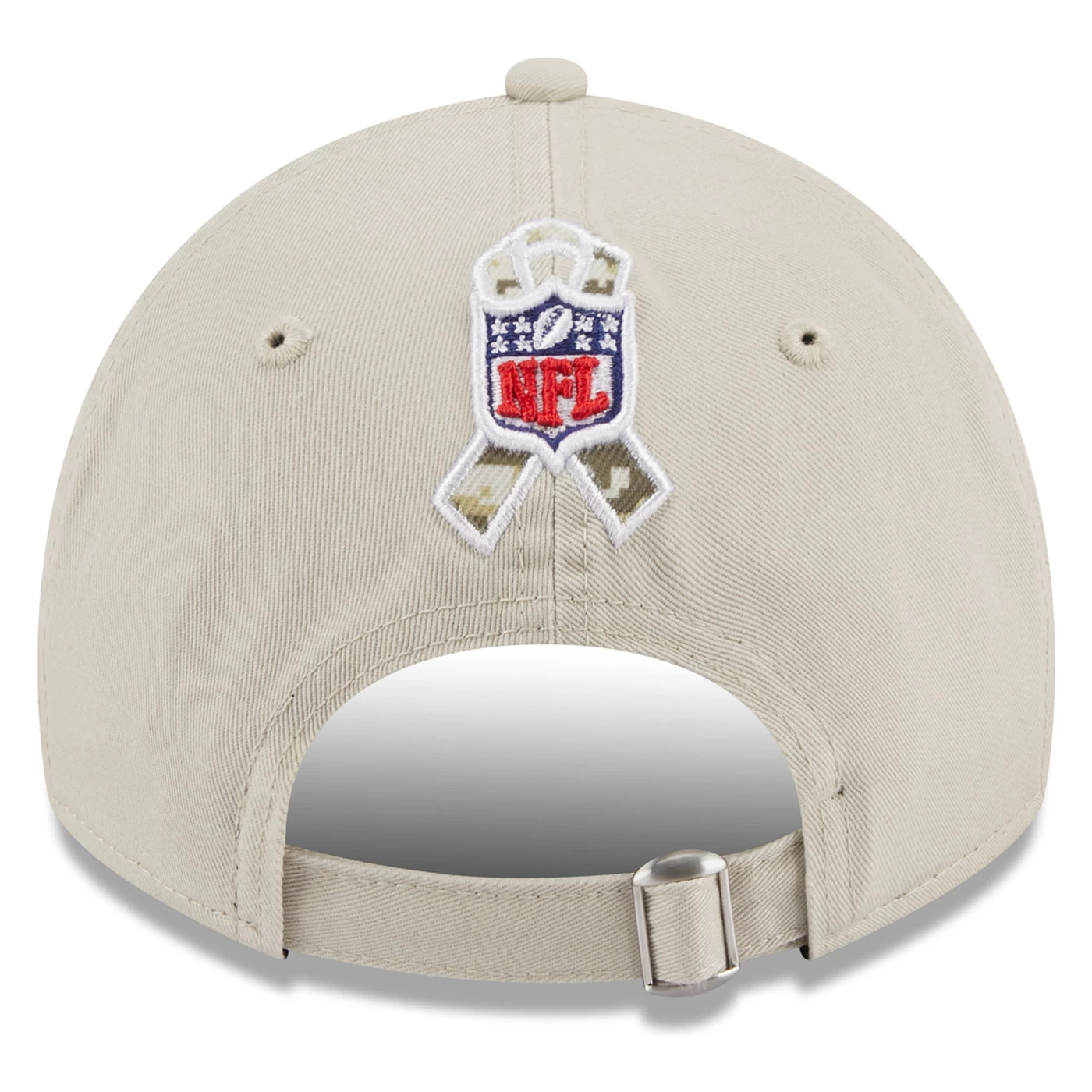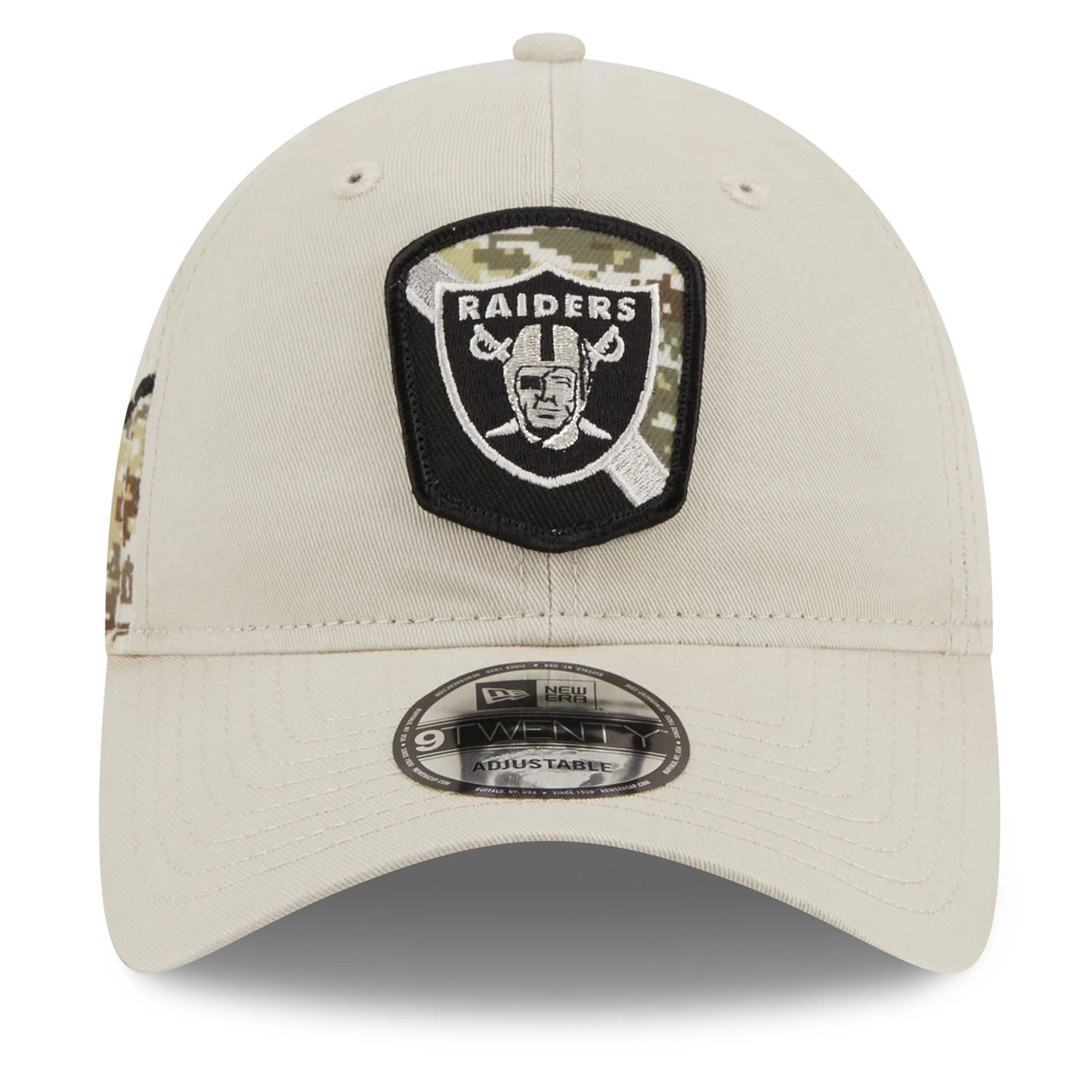 Fit to honor! Join the NFL in honoring our nation’s service members with the Raiders New Era 9Twenty 2023 Salute to Service Cap. This adjustable cap features a split-color custom team shield logo patch at the front plus Digi-tech camo detailing at the right panel and on the undervisor. Additional STS official league logo embroidered at the rear and woven US flag at the right-wear side. 100% cotton.