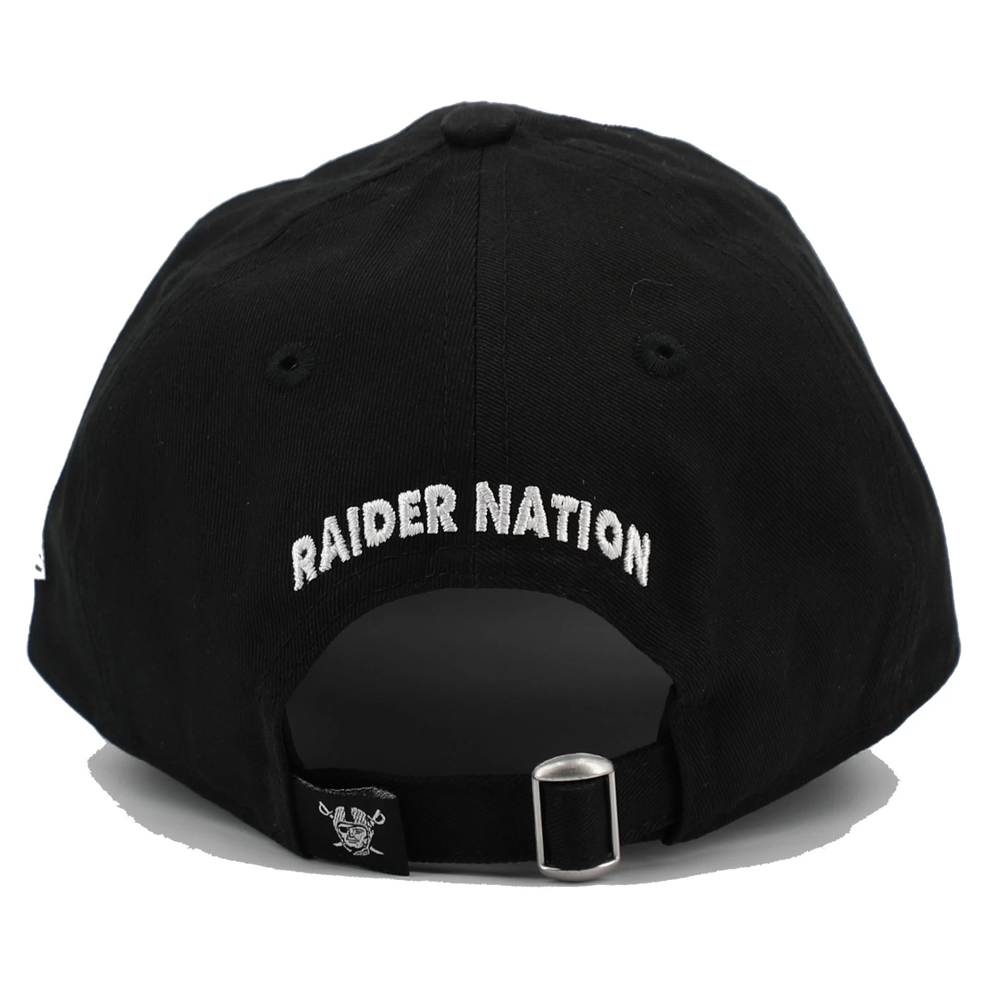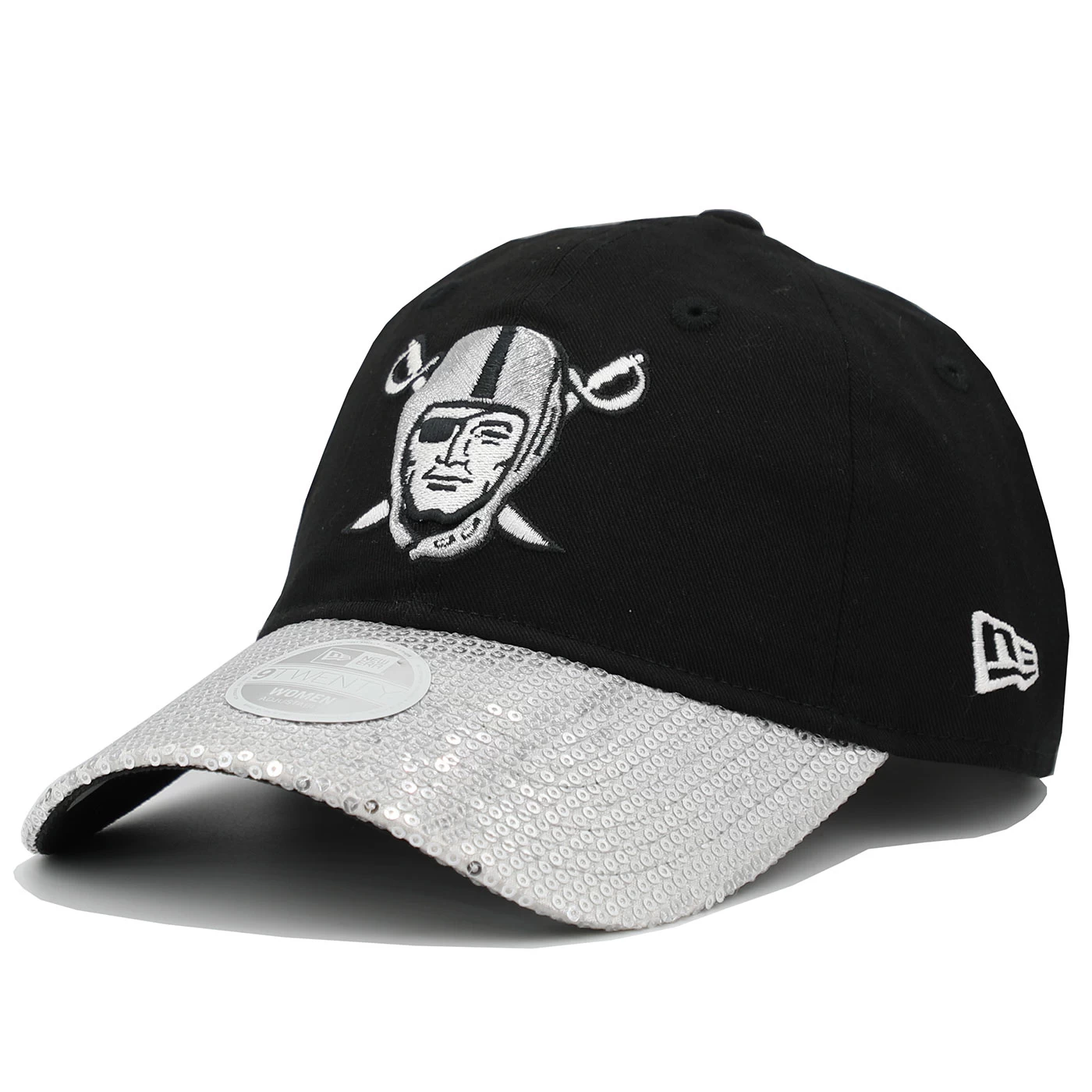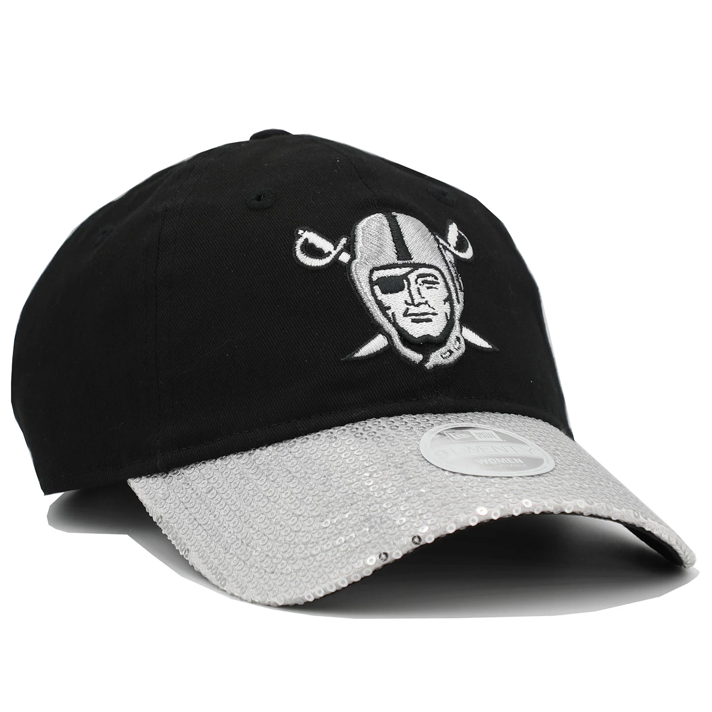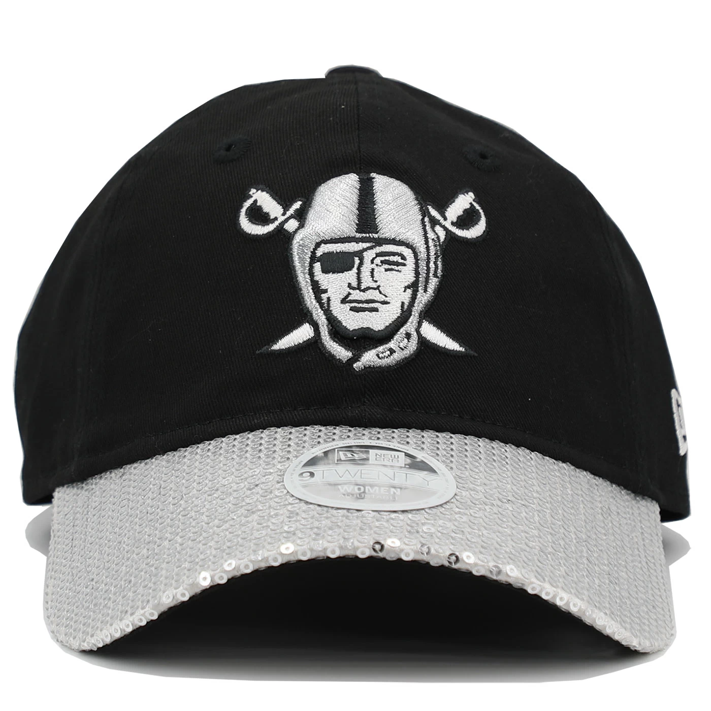 Rep a team exclusive! Designed just for fans the Raiders New Era Women’s 9Twenty 2T Sparkle Cap features raised team pirate logo embroidery across the front panels. This two-tone adjustable cap has an all-over silver sequin visor and features features small “Raider Nation” embroidery at the rear.
