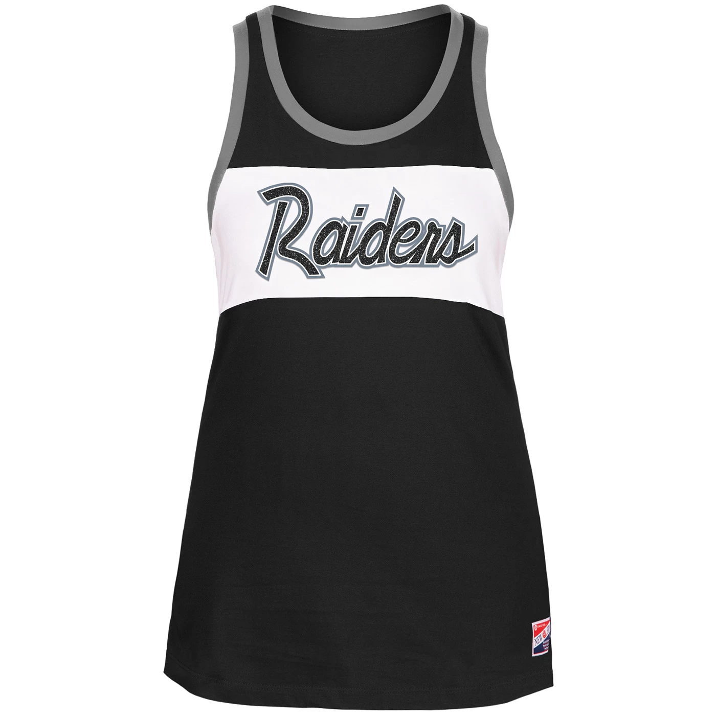 The Raiders New Era Women’s Jersey Racerback Tank is designed with soft stretchy jersey fabrication for a comfortable fit. Features glitter “Raiders” and team shield logo print across upper chest and back with alternate team-colored ribbing at the collar and armholes. 100% cotton.