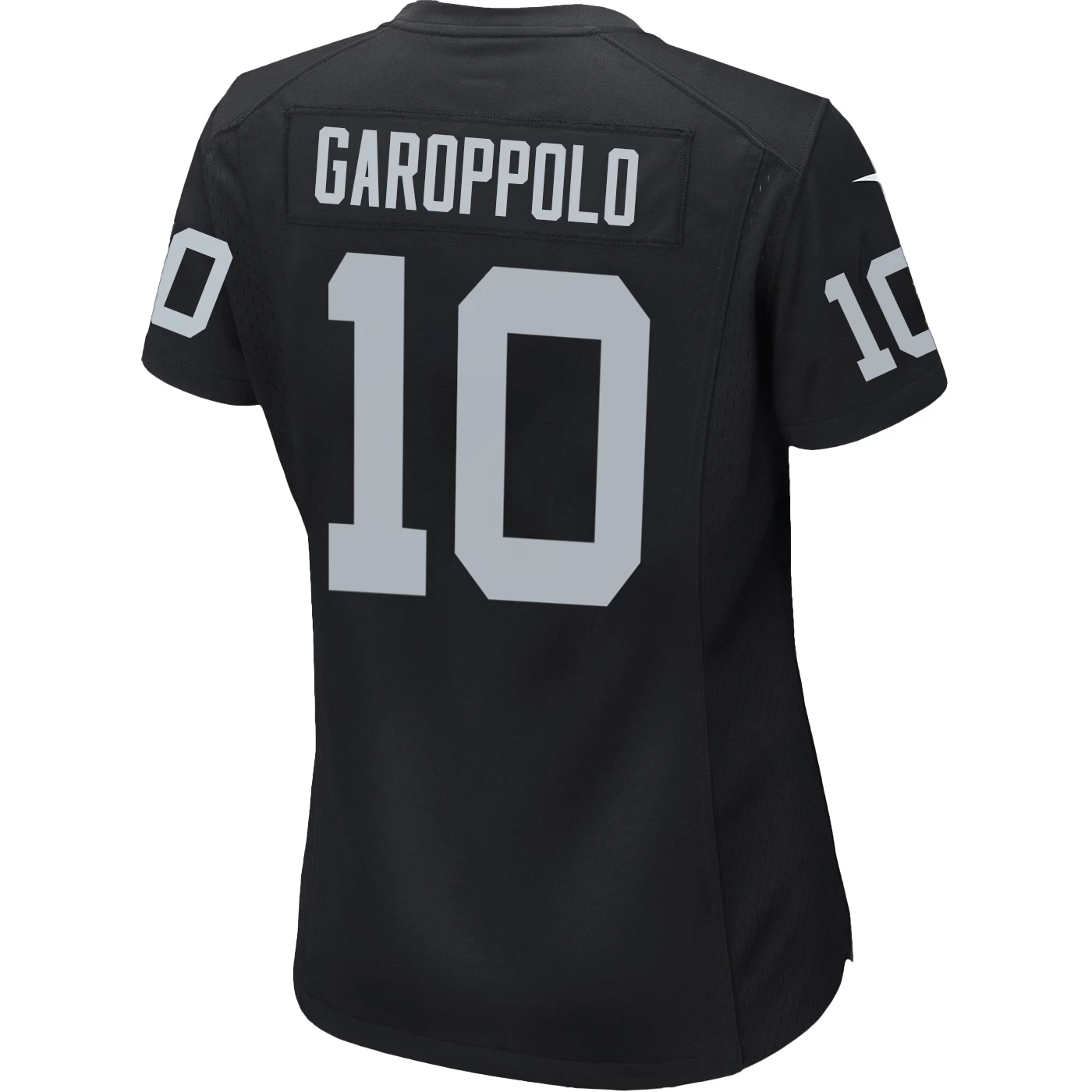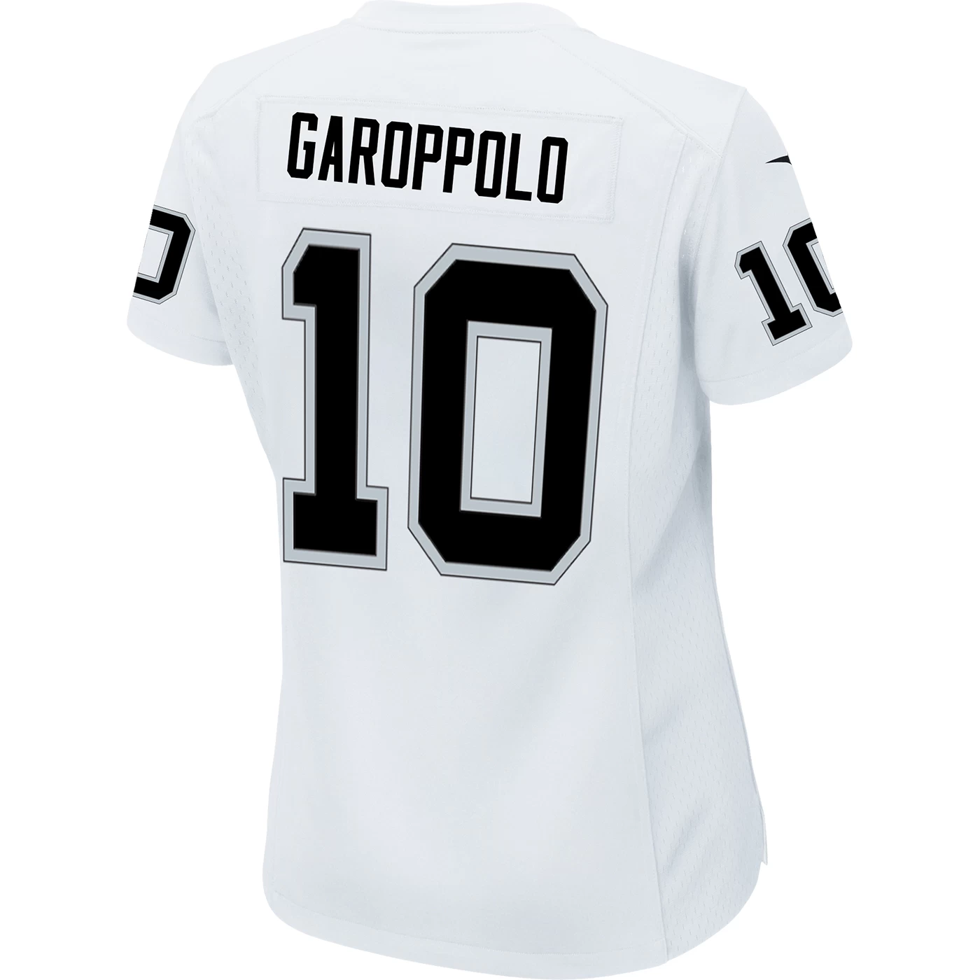 This Nike Jimmy Garoppolo Women’s Game Jersey is designed to a modern fit—removing excess fabric with adjusted armhole sizing as well as adjusted sleeve lengths. Each jersey has a bound clean finished neckband and heat transfer back neck label for zero distraction. It is embellished with a silicone lightweight print player name and number on the front back and sleeves. 100% polyester.