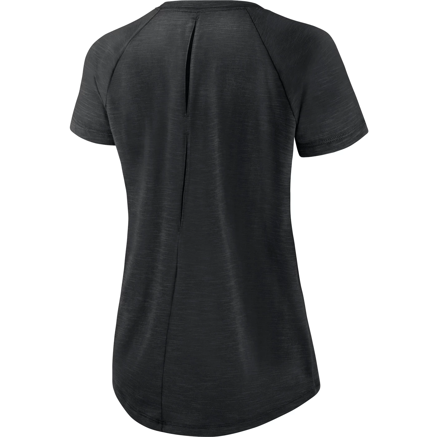 The Raiders Nike Women’s Back Slit Fashion Top is designed with raglan sleeves and a droptail hem for a relaxed fit. This 2-tone slub tee features printed “Las Vegas Raiders” and team shield logo print across the chest with slit back openings that elevates an everyday look. 75% cotton 25% polyester.