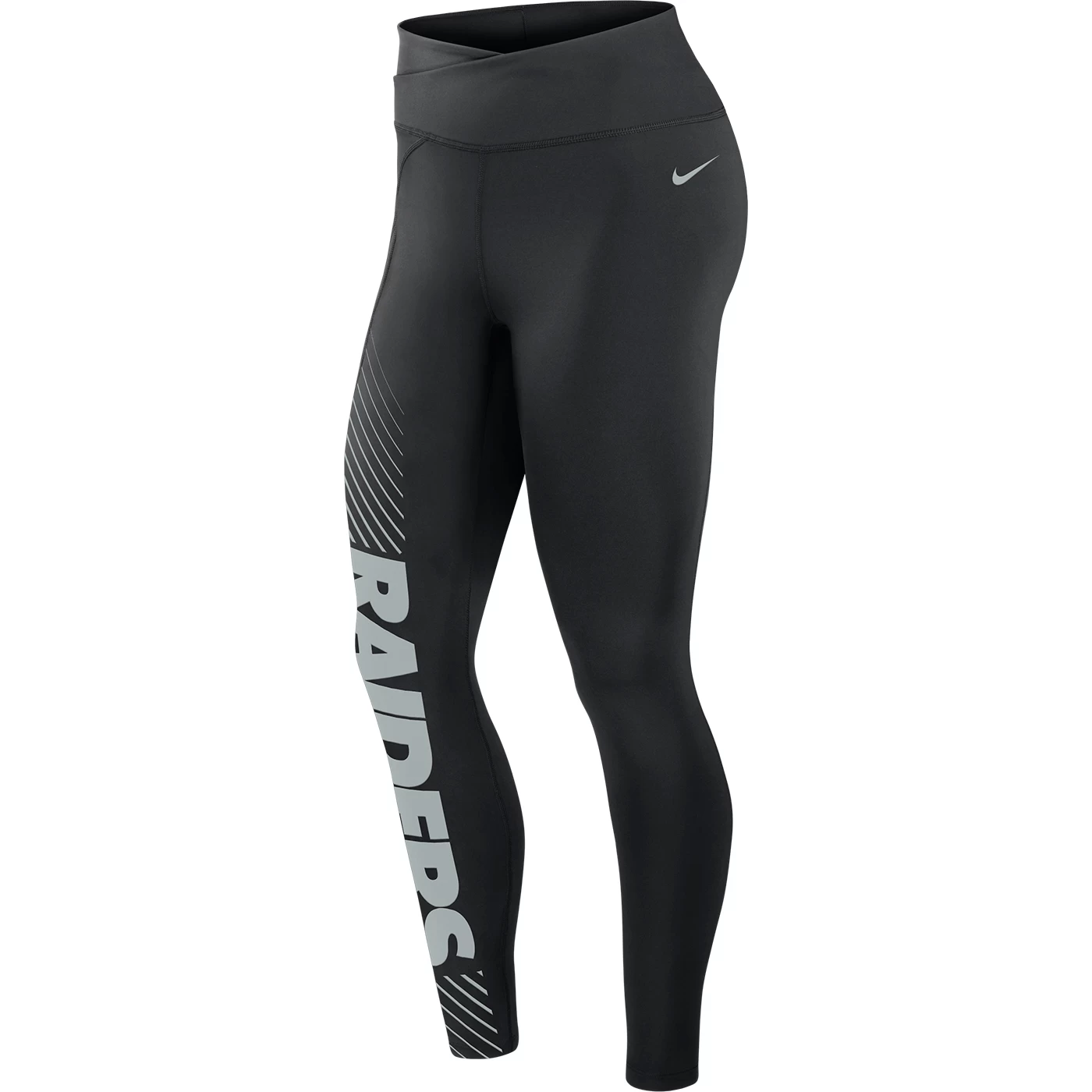The Raiders Nike Women’s Yard Line Leggings are designed with peached Dri-FIT performance fabrication that is incredibly soft and stretchy. These full-length leggings have a crossover waistband plus a slip pocket and silicone “Raiders” screen print at the right leg. 77% polyester 23% elastane.