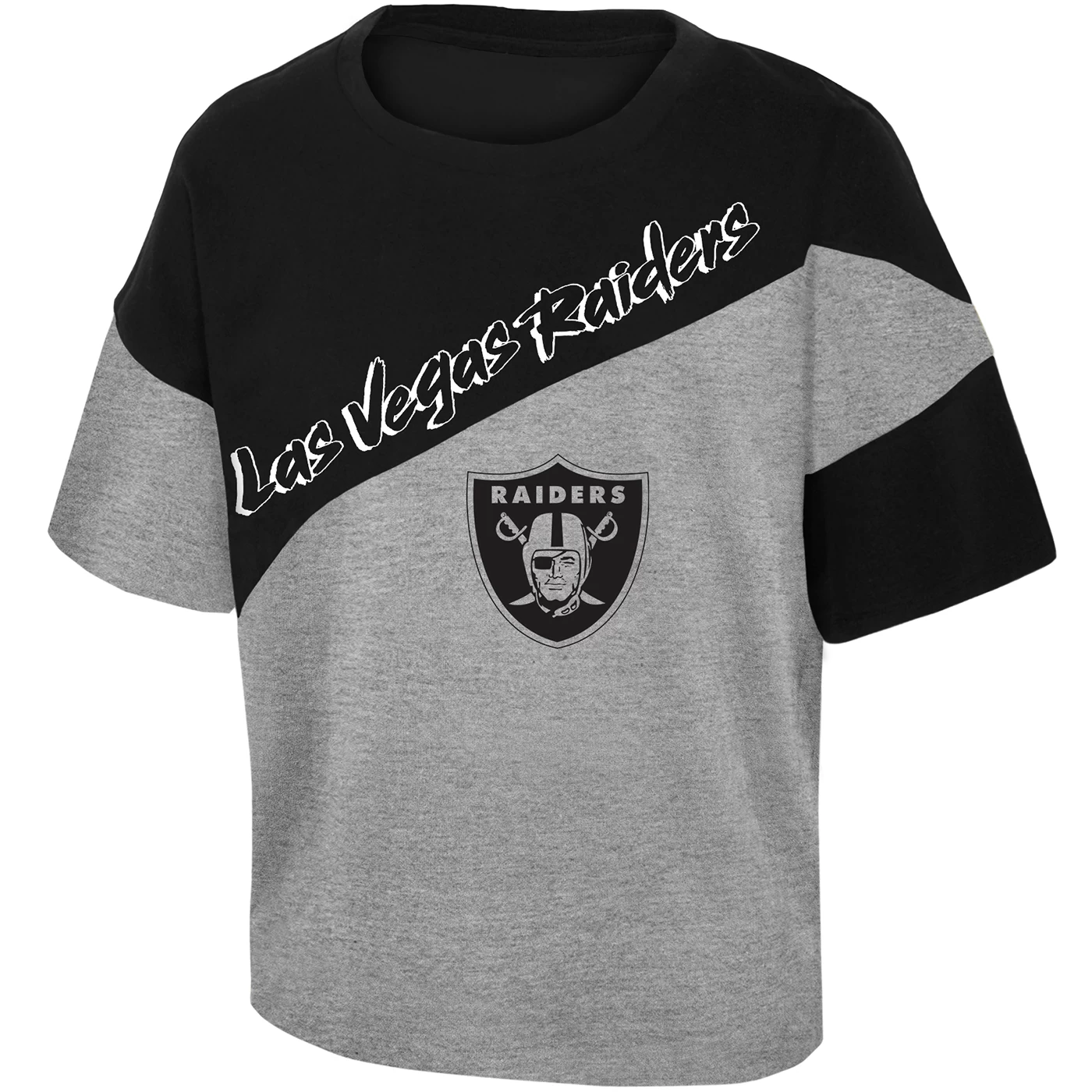 The Raiders Girls Power Up Top by Outerstuff is designed with loose gauge cotton jersey fabrication for a relaxed fit. This kids’ tee has a cropped silhouette that hits just above the hips and features a contrast-colored front and backside as well as “Las Vegas Raiders” and team shield logo print across the chest.
