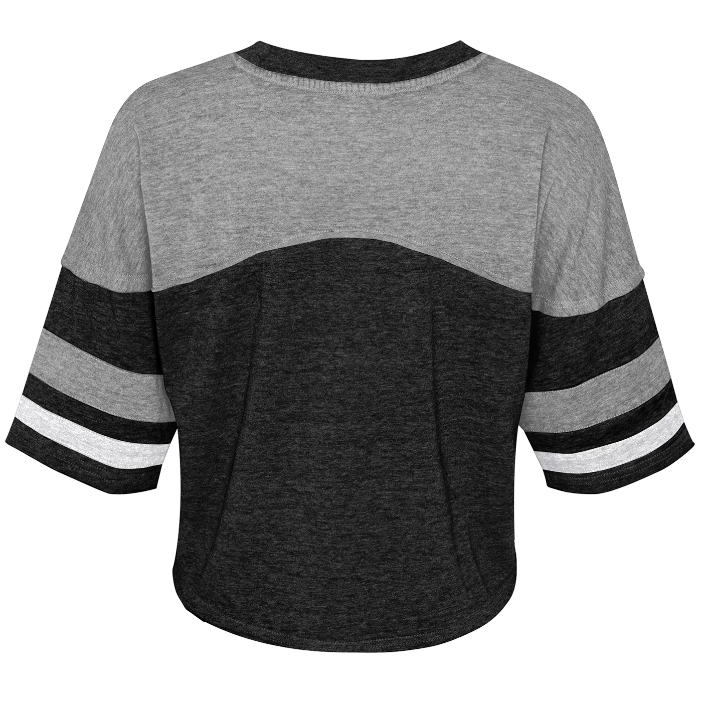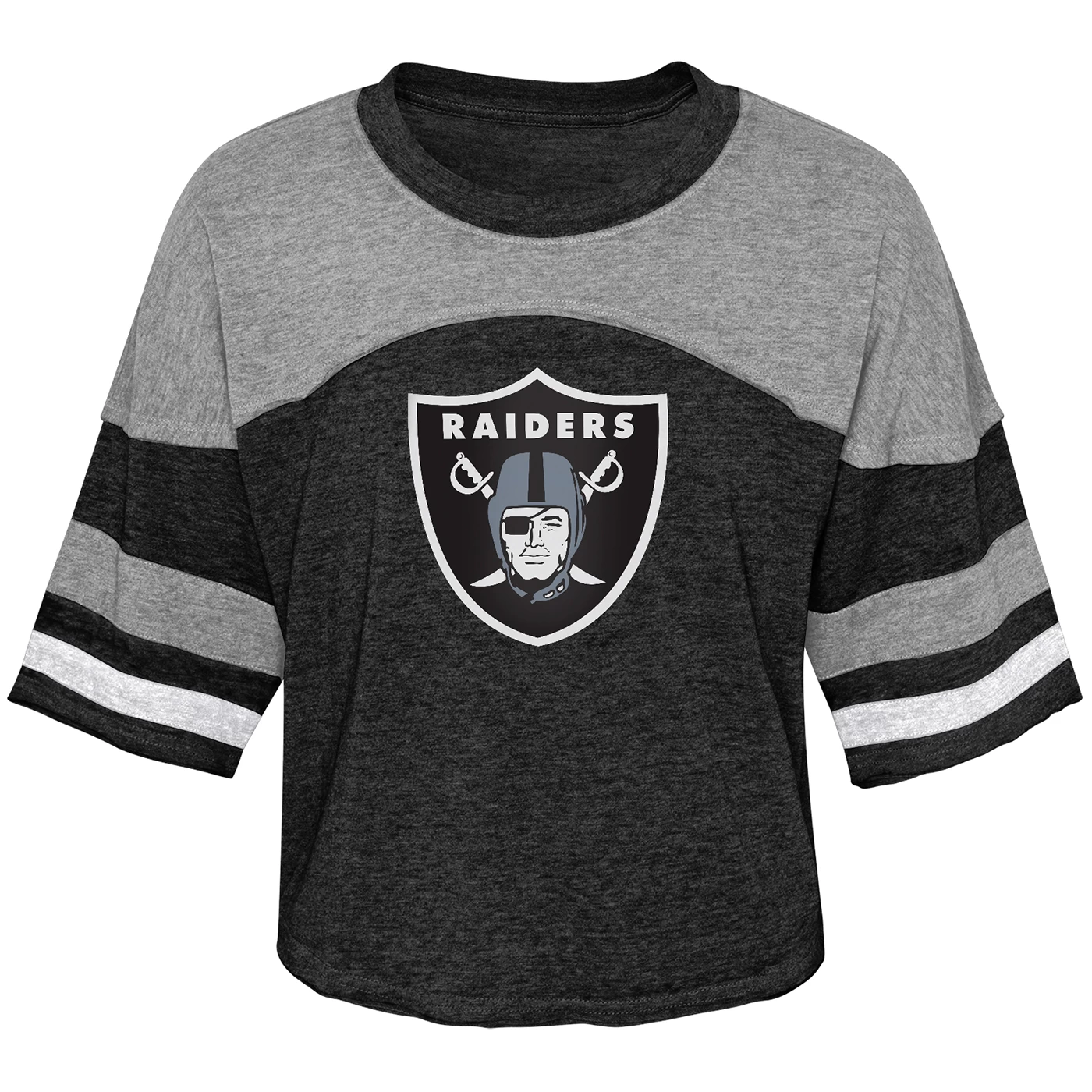 Dress your young fan for Football Sundays with the Raiders Girls Sunday Fun Day Top by Outerstuff. This youth short sleeve fashion jersey top is designed with burnout wash fabrication and raw edge hems for a relaxed fit. Features self fabric overlay stripes at the sleeves and team shield logo print at center chest. Made from cotton polyester.