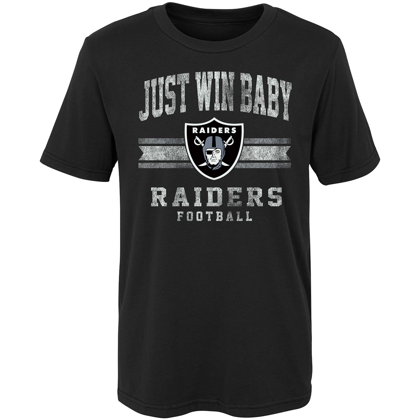 Celebrate the history of the team your young fan will be cheering for this year! The Raiders Juvenile Just Win Baby Tee by Outerstuff features a team shield logo and distressed “Just Win Baby” and “Raiders Football” print across the chest. 100% cotton.