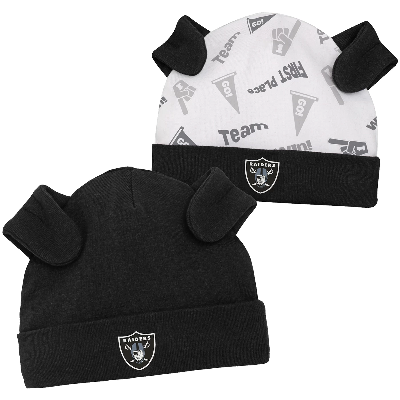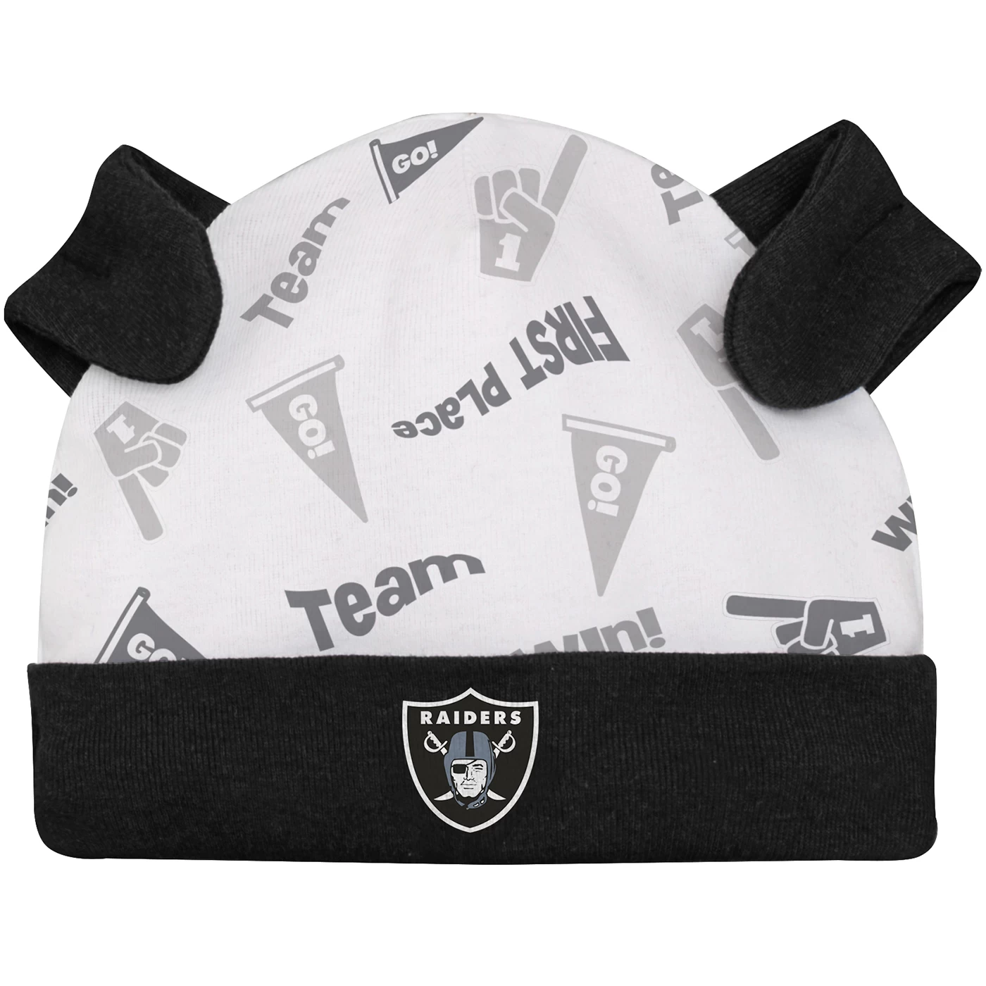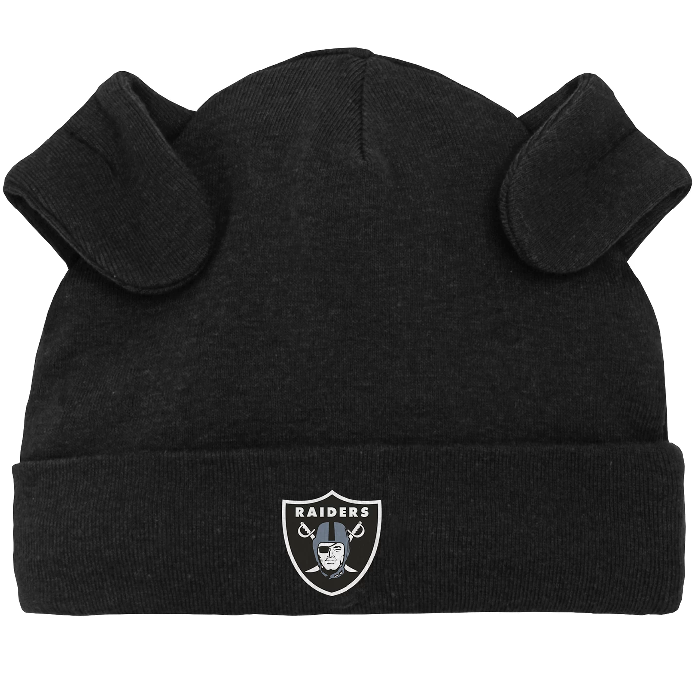 Dress up the newest Raiders fan in your life! The Raiders Newborn Baby Bear Beanie comes in a two-piece set with alternating colors and team chant print. These knit caps have generic bear ears and feature team shield logo print at the front cuff. Designed with durable knit fabric so your baby can rep the Raiders all year long. 100% cotton.