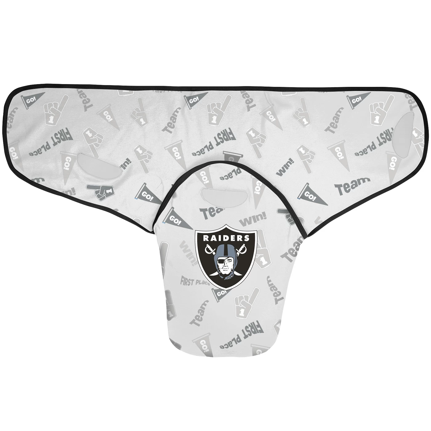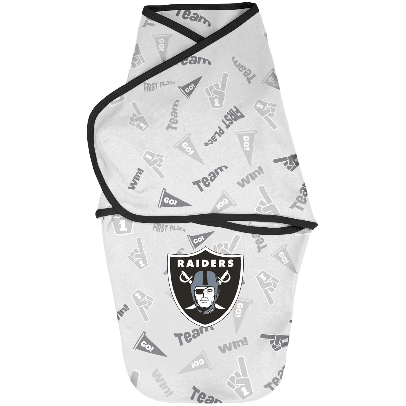 The Raiders Newborn Baby Cocoon Two Piece Swaddle Set creates a safe cozy feeling for the newest Raiders fan in your life. Soft fabric wings are decorated with black trims and repeat team chant print and have a Velcro closure for a secure fit. Additional zippered closure at the bottom. 100% cotton.