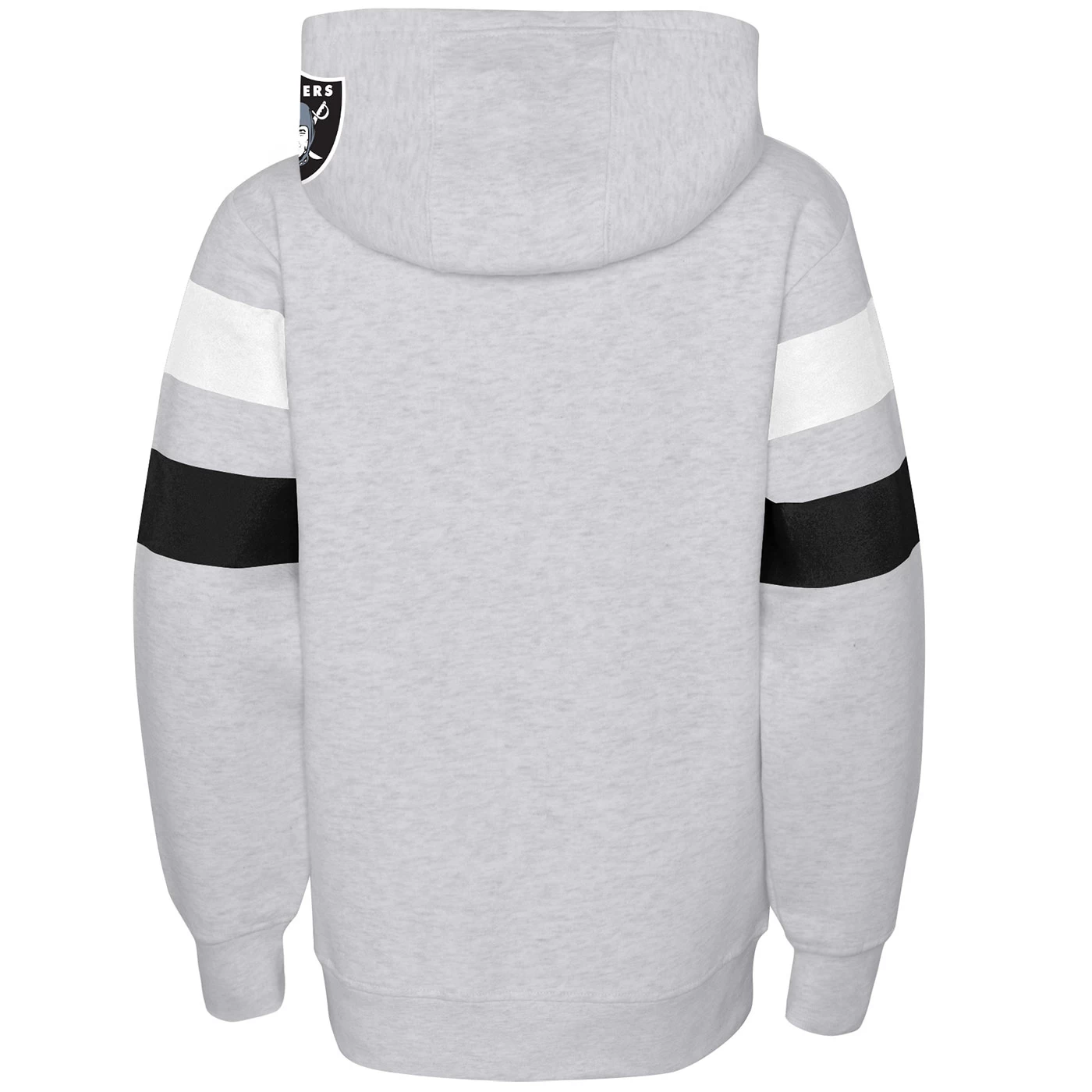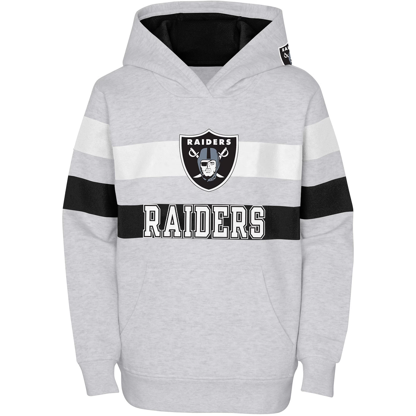 The Raiders Youth Dynamic Duo Hood by Outerstuff is designed with heathered fabrication and has alternating team-colored stripes across the body and contrast color lining on the inside of the hood. Features “Raiders” and team shield logo embellishment on the body and hood.