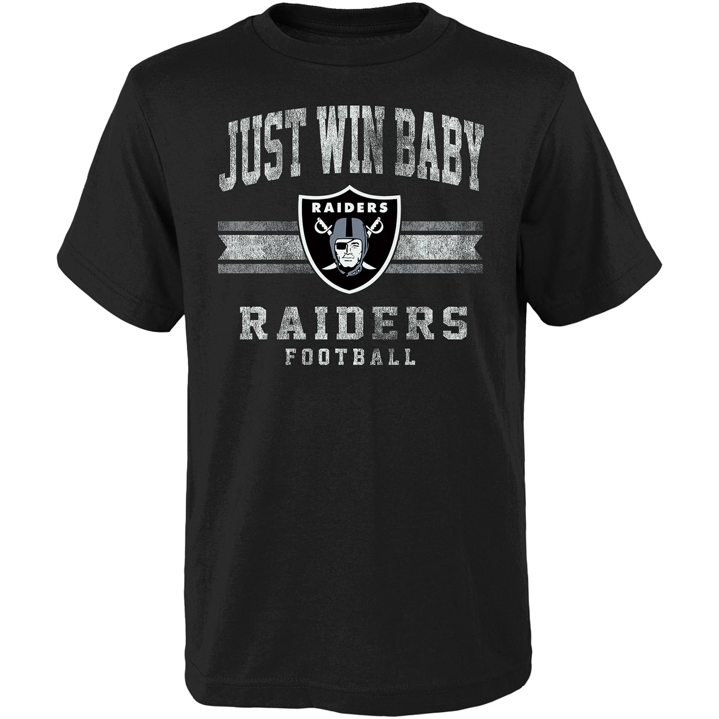 Celebrate the history of the team your young fan will be cheering for this year! The Raiders Youth Just Win Baby Tee by Outerstuff features a team shield logo and distressed “Just Win Baby” and “Raiders Football” print across the chest. 100% cotton.