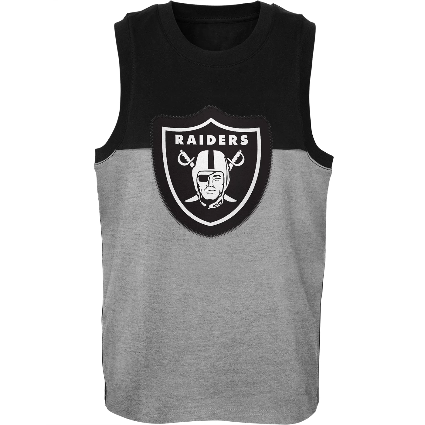 The Raiders Youth Revitalize Tank by Outerstuff is designed with lightweight cotton jersey fabrication and has a ribbed collar and armholes. This kids’ colorblocked tank top features a printed team shield logo applique with zig zag stitch at center chest. 100% cotton.