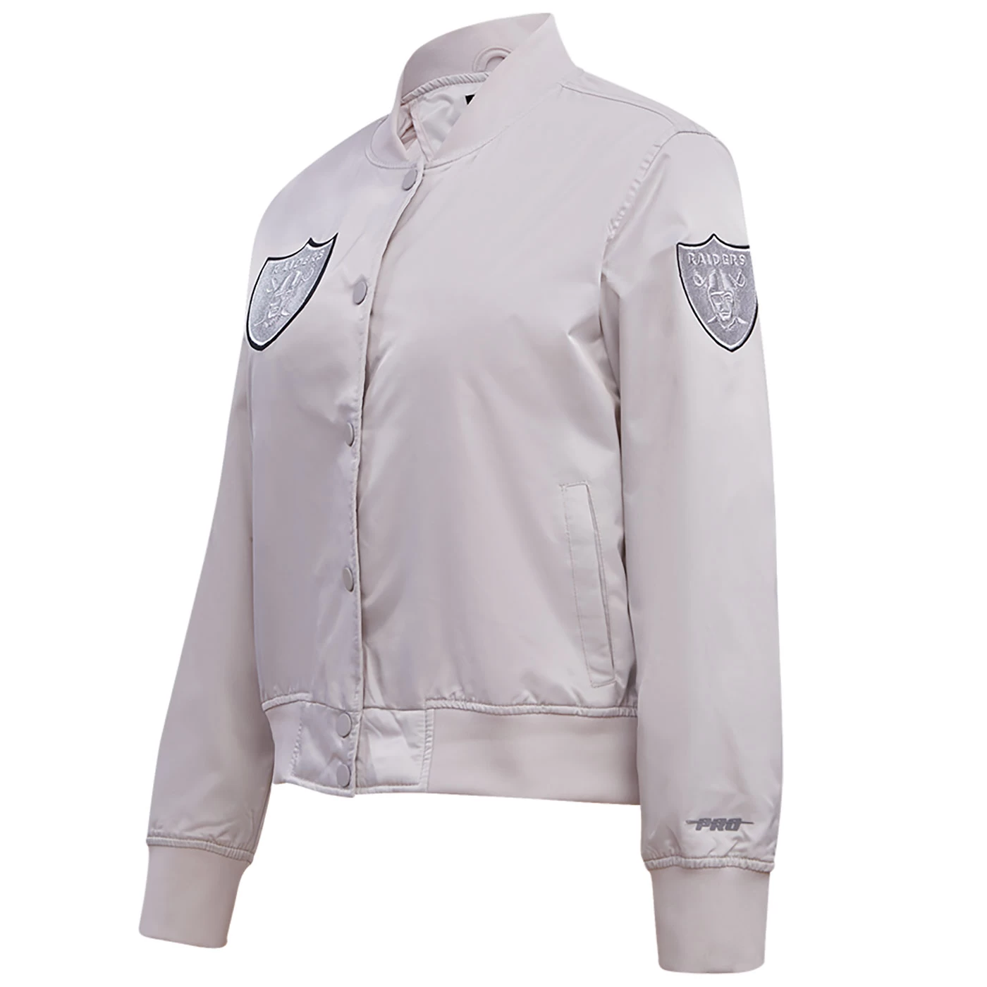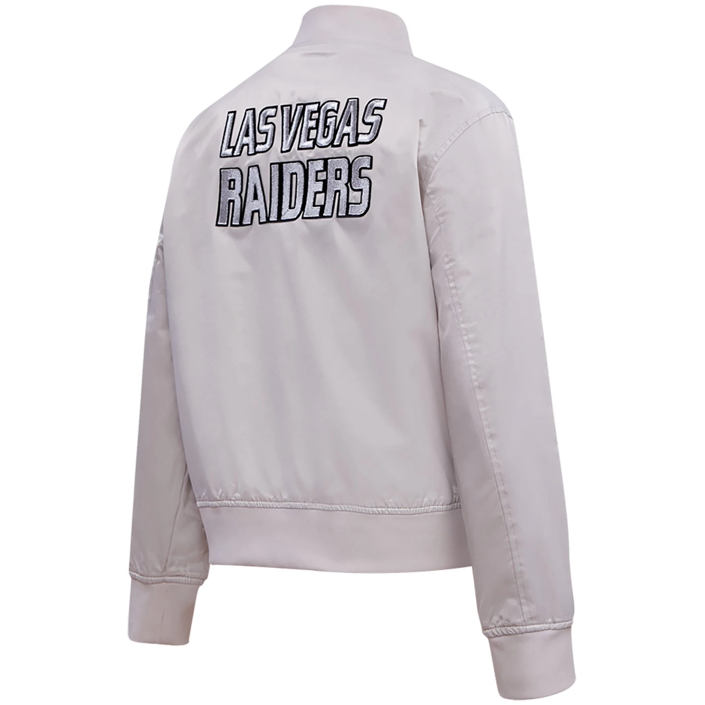 Gameday glam in time for the holiday season! The Pro Standard Las Vegas Raiders Holiday Glam Satin Jacket is a lightweight full-snap jacket that has a stand-up collar and sits at your hips for a tailored look. Features silver fabric team name and shield logo appliques at upper left chest sleeve and back. 100% polyester.