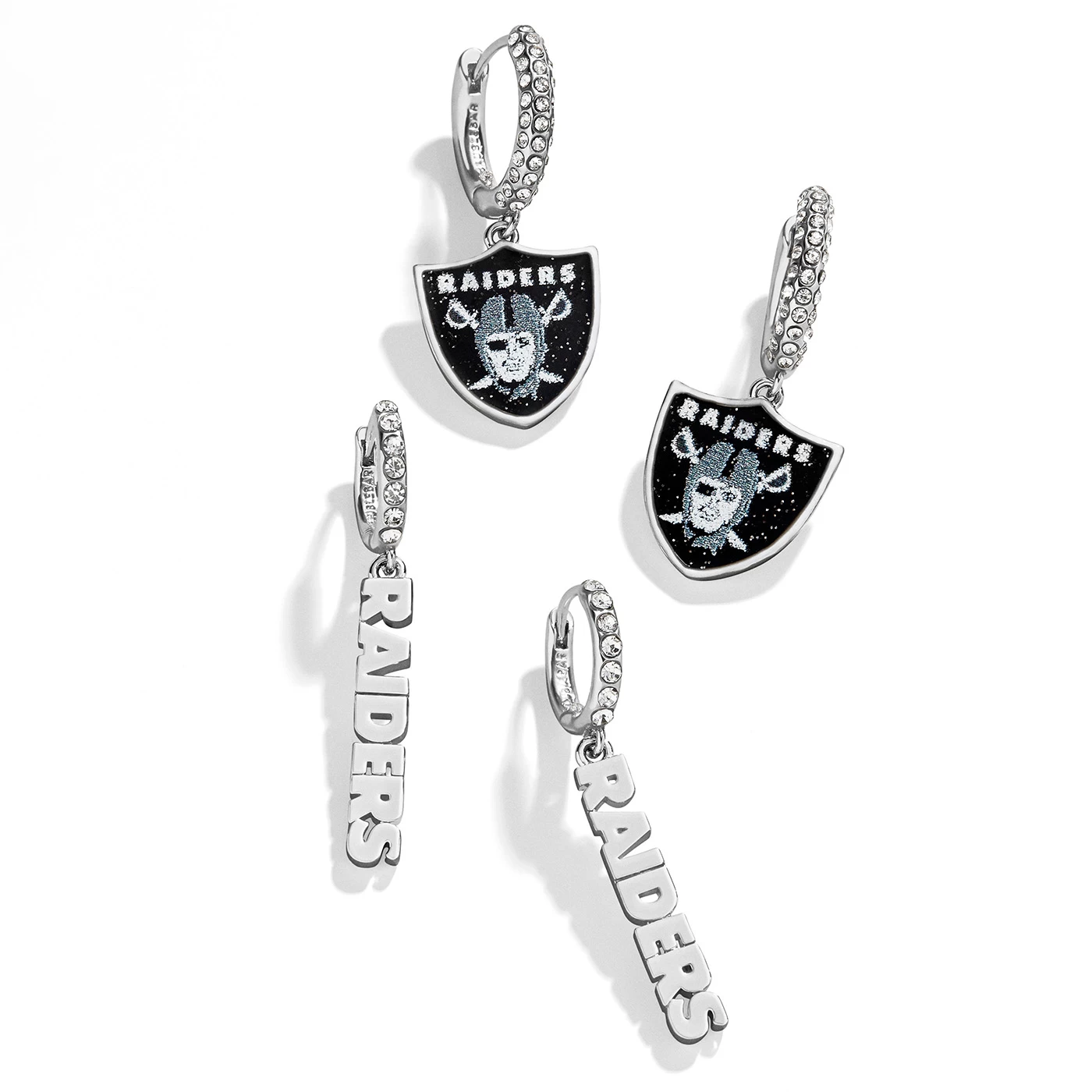 Elevate your gameday accessories! The Raiders Earring Set by BaubleBar contains two pairs of huggies featuring glitter enamel Raiders shield and wordmark logos. These earrings have a hinge backing and are hypoallergenic. Each pair measures approximately 1.24″ x 0.56″.