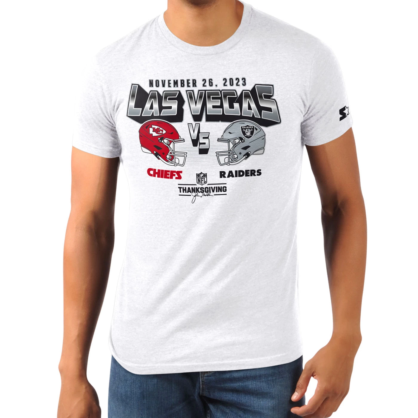Commemorate the 2023 season with the Starter Chiefs vs. Raiders Primetime Head to Head Tee! This matchup tee features screen printed graphics of both Chiefs and Raiders helmets plus the date of the game. 100% cotton.
