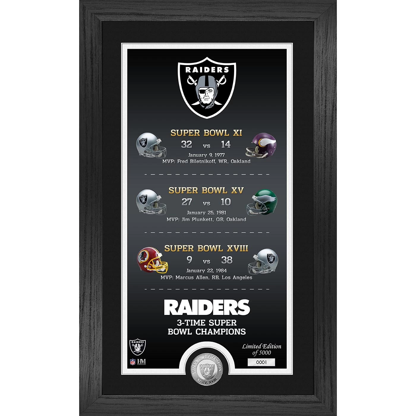 Celebrate the Raiders titles with the Super Bowl Legacy Coin Photo Mint by The Highland Mint. Featuring a 15″ x 7″ hand numbered commemorative photo that includes the team shield logo as well as each head-to-head match up final score and MVP. 39mm minted 3-time Super Bowl Champions coin displayed below the photo. Double matted frame measures approximately 12″ x 20″ and comes ready to hang.